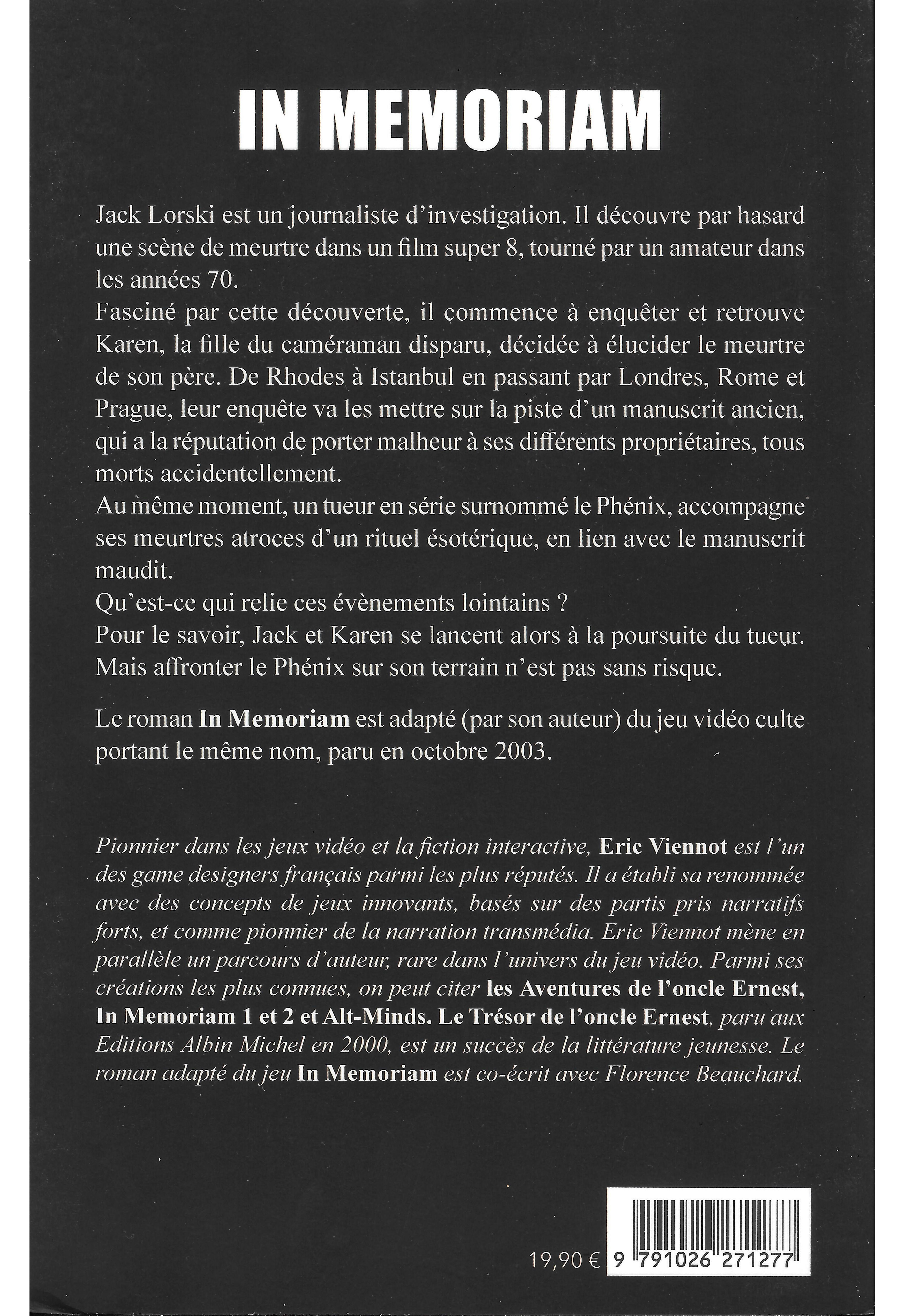 Co-écrit par Eric Viennot et Florence Beauchard, le roman In Memoriam est adapté du thriller interactif du même nom, sorti en 2003. Il permettra à tous les joueurs de l’époque de se replonger dans l’univers du jeu près de 18 années plus tard. Les autres découvriront l’enquête de Jack Lorski et de Karen Gijman sur les traces du tueur en série esthète surnommé le Phénix. Pour les besoins du roman, de nouveaux personnages apparaissent, certaines séquences qui n’existaient pas dans le jeu ont été ajoutées, et la fin sera différente.