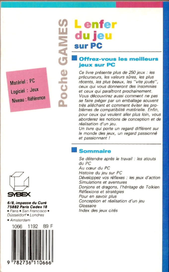 L'Enfer du jeu sur PC a été écrit par Ulysse, l'auteur de plusieurs jeux pour Loriciel (Karma, Zone, Starvega...). On y trouve un survol de tous les genres de jeux vidéos et de leurs meilleurs représentants sur PC. L'auteur s'attarde ensuite sur plusieurs jeux en fonction de ses expériences personnelles, positives ou négatives : la profondeur de la trilogie The Bard's Tale, la richesse de Sword of the Samurai, la linéarité décourageante de Heart of China, les bugs de Might & Magic III... Le livre est complété par un résumé de l'évolution technique des PC, un chapitre sur la configuration à choisir et la gestion de la mémoire, quelques notions de programmation, ainsi qu'un glossaire.