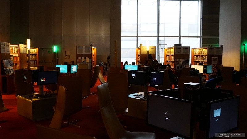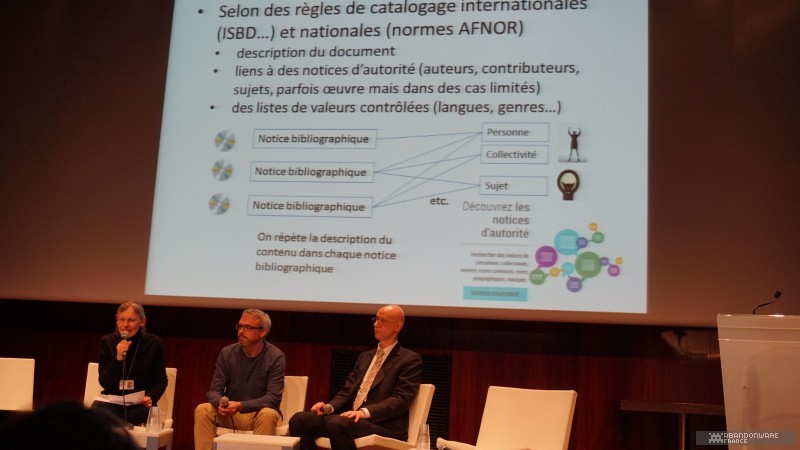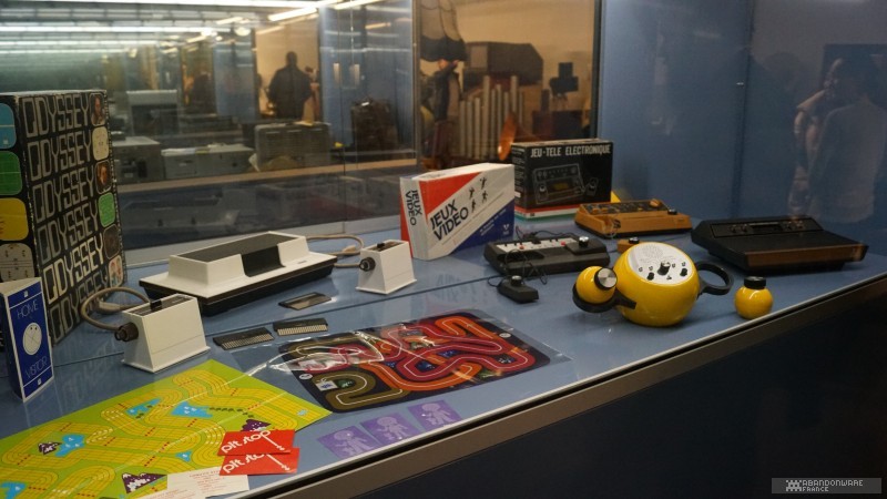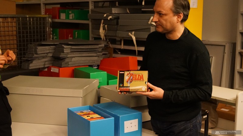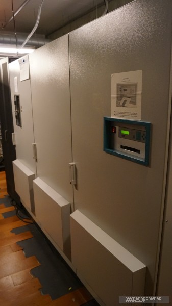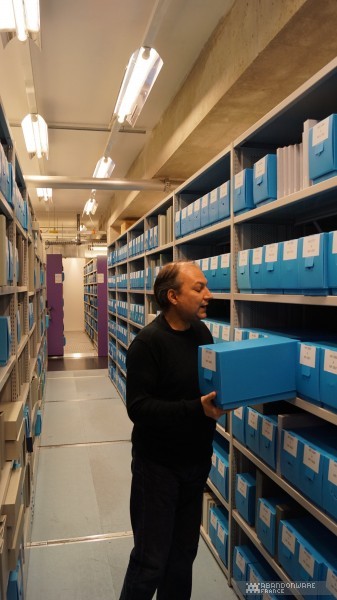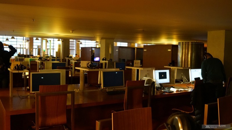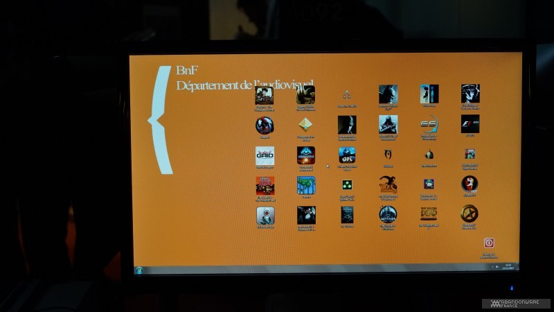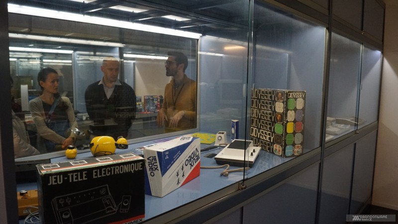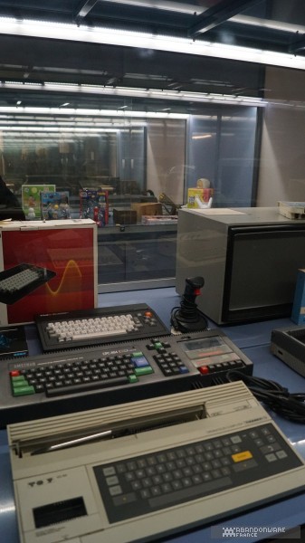 Le matin, avec Hoagie, nous allons visiter les coulisses de BnF. Nous croisons déjà quelques connaissances, comme le journaliste Patrick Hellio, avec qui nous discutons. La collection Charles Cros, que nous connaissions déjà pour l'avoir visitée lors des journées du patrimoine, regroupe de nombreux appareils audio, consoles et ordinateurs entreposés dans des vitrines au 17ème étage d'une des tours de la BnF. On nous explique la façon dont les machines sont collectées et les détails du dépôt légal. Puis, très rapidement (plusieurs groupes se succèdent dans la matinée), on nous envoie dans les sous-sols pour découvrir un lieu que la BnF ouvre très rarement, les magasins, c'est-à-dire le lieu où sont préservés les jeux vidéo (et les autres articles comme les livres, les films, etc.). On nous montre les différents formats de boîtes qui contiennent les jeux, les étagères, le classement, les conditions de stockage... Et hop, nous voilà partis dans les bureaux de numérisation. Près d'une sorte d'armoire électronique servant à réaliser les sauvegardes de disques optiques, on nous parle du processus d'archivage et de l'utilisation de "solutions de contournement" (expression plus acceptable que "crack"). Et on continue la visite au pas de charge pour nous faire découvrir la salle de lecture, le lieu où l'on peut (sur accréditation) observer, découvrir les documents et les jeux. Enfin, on termine la matinée dans une salle de lecture dédiée au public où l'on peut jouer à une sélection de jeux sur cinq machines (des PC, une PS4, une PS3).