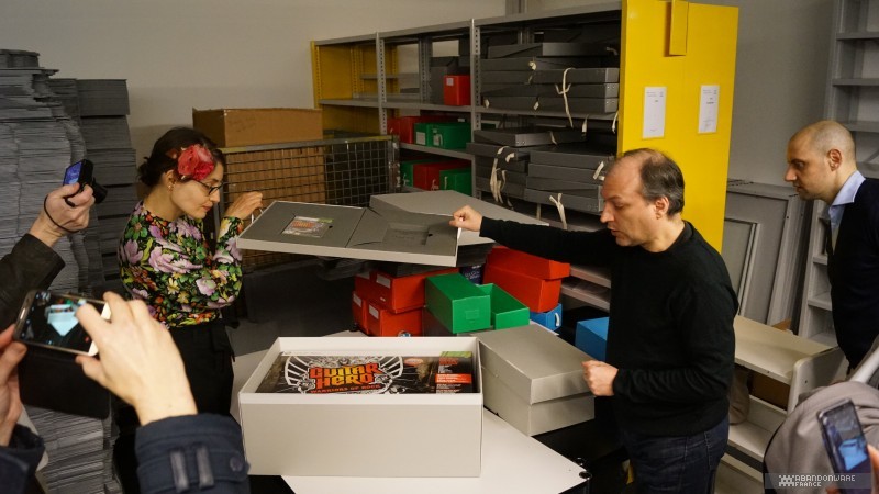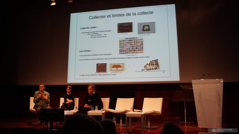 Une fois la visite terminée (elle aura duré 1h30), nous allons déjeuner rapidement. Nous revenons à la BnF pour le début du colloque proprement dit à 14h. UBN22 et VegetableMan nous ont rejoints. Je suis au premier rang avec tous les invités et mes amis me soutiennent juste derrière. Bertrand Brocard ouvre ce colloque dans la bonne humeur. Après un discours prononcé par le député Denis Masséglia, Marion Coville et Benjamin Barbier (chercheurs) parlent du jeu vidéo en tant qu'objet culturel et de la patrimonialisation, puis Elodie Bertrand (BnF) et Isabelle Astic (Musée des Arts et Métiers) présentent les enjeux de la patrimonialisation et les problèmes soulevés dans ce domaine par les modèles économiques récents (les éléments de jeux sur un serveur distant et protégé, par exemple). Bertrand profite de l'occasion pour ouvrir un carton d'objets de sa collection personnelle, avec entre autres un trombinoscope du personnel d'Infogrames dont plusieurs visages se sont retrouvés dans des jeux Cobra Soft, des ébauches pour la couverture d'un jeu...