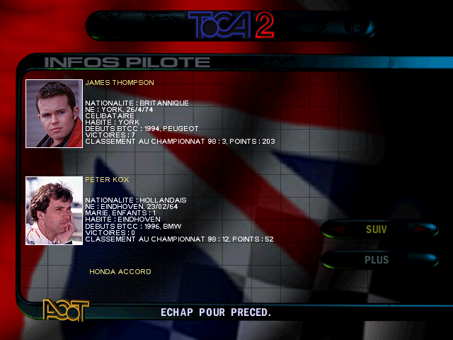 ConclusionOn ne change pas une équipe qui gagne, et TOCA 2 vient conforter l'adage avec un jeu qui hisse le niveau à une hauteur vertigineuse. On frôle l'Abandonware d'or, car la difficulté rencontrée rend le challenge compliqué à relever : en Championnat, prévoyez des heures de conduite à foison pour ne pas vous faire éjecter faute de niveau. Heureusement, vous allez pouvoir sauvegarder votre progression, et user du mode Replay pour progresser et devenir le roi de l'asphalte.