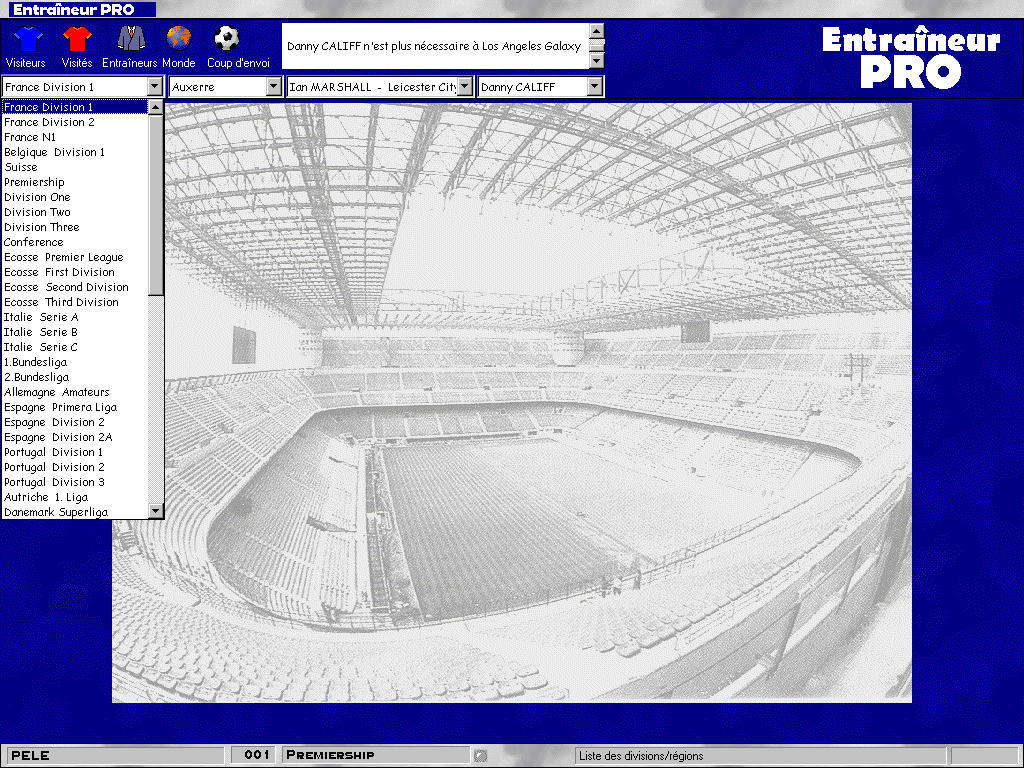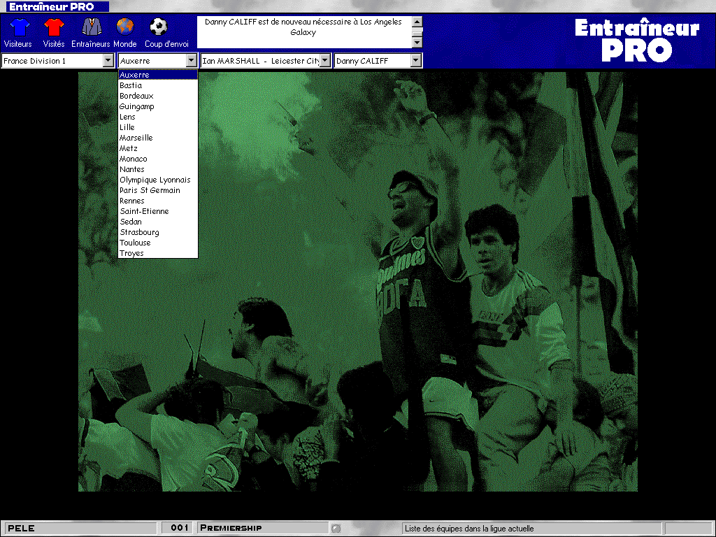 PrésentationVous aimez les logiciels de gestion de club de football ? Les interfaces arides et les tableaux de chiffres ne vous font pas peur ? Alors Entraîneur pro pourrait s'adresser à vous, mais j'en doute. Il a été réalisé par la même équipe et porte le même nom anglais (Tactical Manager 2) qu'un logiciel Amiga sorti cinq ans plus tôt, mais la réalisation n'a plus rien à voir - et, je suppose, le contenu non plus, parce qu'en cinq ans il s'est passé des choses dans le milieu du football. Au moins, la version Amiga proposait des graphismes honnêtes, à défaut d'être satisfaisante. Dans cette version Windows, on a une photo digitalisée au choix en fond d'écran, et des menus déroulants et des fenêtres dignes d'un logiciel de bureautique pour Windows 3.1. La jaquette s'enorgueillit d'une énorme base de données modifiable à loisir et couvre tous les clubs de la planète, mais le titre du CD-ROM, beaucoup trop proche de L'Entraîneur - Saison 99/00, ne plaide pas en sa faveur et ne fera guère d'ombre à son illustre rival.