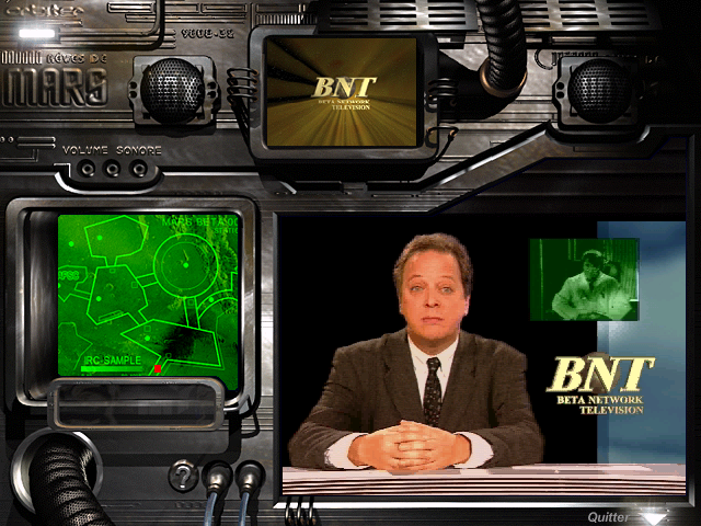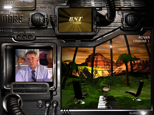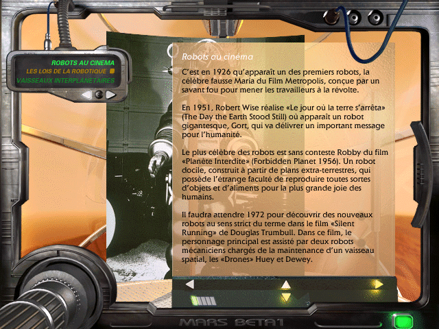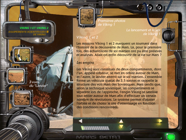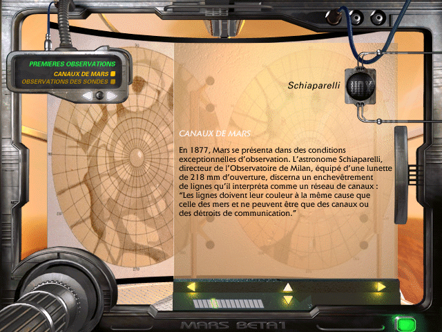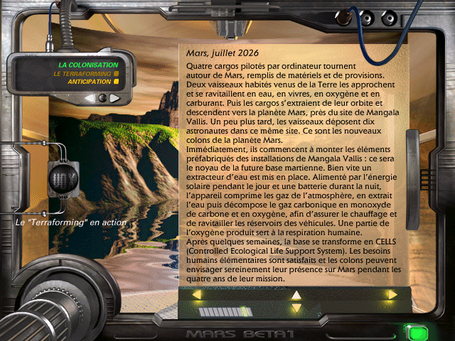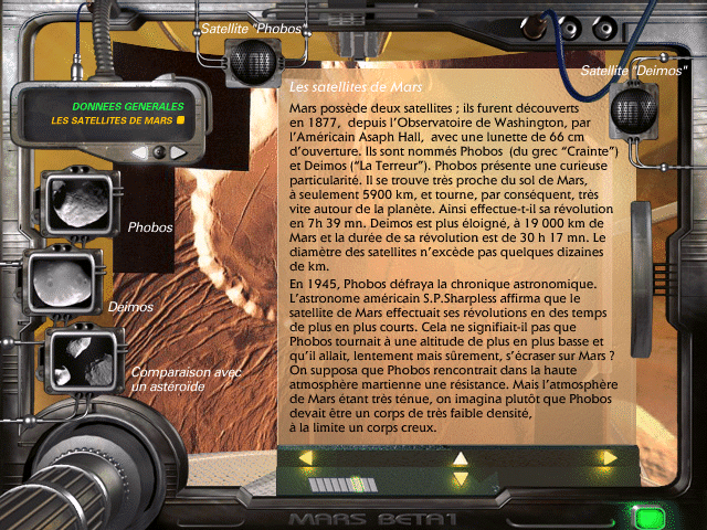 PrésentationQuelle est la face cachée de Mars ? Pourquoi cette planète fascine-t-elle tant les Humains ? Comment a-t-elle découverte, imaginée, fantasmée et explorée ? Peut-on la coloniser ? Autant de questions auxquelle le CD-ROM Rêves de Mars tente de répondre. Spécialisé dans l'imagerie 3D, le studio Nexus Interactions a modélisé les coursives d'une base spatiale dont les pièces sont différentes rubriques à compulser : astronomie, expéditions scientifiques, culture... Les auteurs ont aussi fait preuve d'anticipation en imaginant un scénario de colonisation de la planète rouge en juillet 2026, et des interviews en FMV expliquant les défis du terraforming - ou les opérations à mener pour rendre la planète habitable. La partie scientifique est expliquée en vidéo par Philippe Masson, professeur de géologie planétaire et de planétologie à l'université Paris-Sud (Orsay). On peut regretter l'absence d'un planisphère en 3D qui permettrait de voir Mars sous tous les angles et de suivre ses canaux, ou même d'une section plus ludique, mais il y a assez de contenu pour s'occuper un moment.