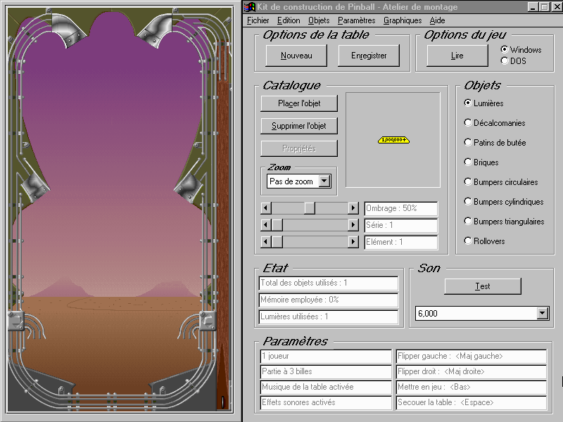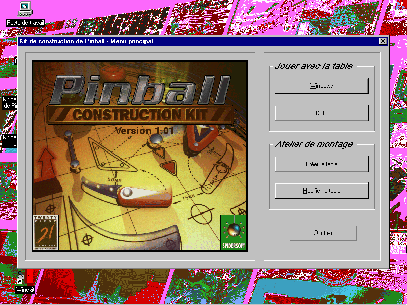 Si vous faîtes partie des fans de pinballs (les flippers numériques qui imitent les lois de la mécanique des vrais flippers) et que vous aimez bidouiller des jeux de construction, ce titre est d'abord un logiciel utilitaire destiné à ceux qui veulent créer le flip qui leur ressemble. Ce logiciel reprend les bases d'un précédent utilitaire datant de 1985 (pour IBM car il avait été conçu pour Apple II dès 1982), mais avec l'équipe qui a développé les perles du Pinball depuis le début des années 1990 (Pinball Dreams, Pinball Mania, Pinball 2000). Vous disposez de 32 modèles de base, avec 8 tables et 4 configurations par table. Vous pouvez alors modifier ces tables en ajoutant des champignons (bumpers), des décalcomanies, des lumières...). Vous pouvez aussi importer des éléments depuis votre ordinateur, à condition de maîtriser des aspects techniques qui ne sont pas accessibles à tous les usagers. On peut par exemple importer des graphismes en BMP depuis son PC.