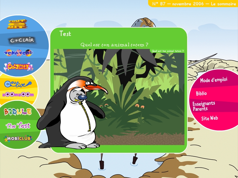 Et toutes les autres rubriques...La caractéristique des Mobiclics est la diversité non seulement des sujets abordés, mais aussi de la façon de les aborder. On ne s'ennuie jamais, que ce soit en admirant avec Marc Laberge de splendides photographies de phénomènes qui pour être naturels n'en sont pas moins impressionnants, en découvrant l'ours brun des Pyrénées (alors presque disparu de France et dont la réintroduction ne faisait pas l'unanimité - faites-vous votre opinion en écoutant deux points de vue opposés) ou en se testant (j'ai ainsi pu déterminer que mon animal-totem était le tigre - j'ai donc appris à feuler Aahrrfff ! et même à rugir Roaarr !!!).
