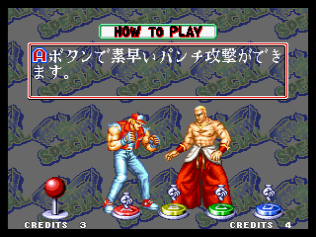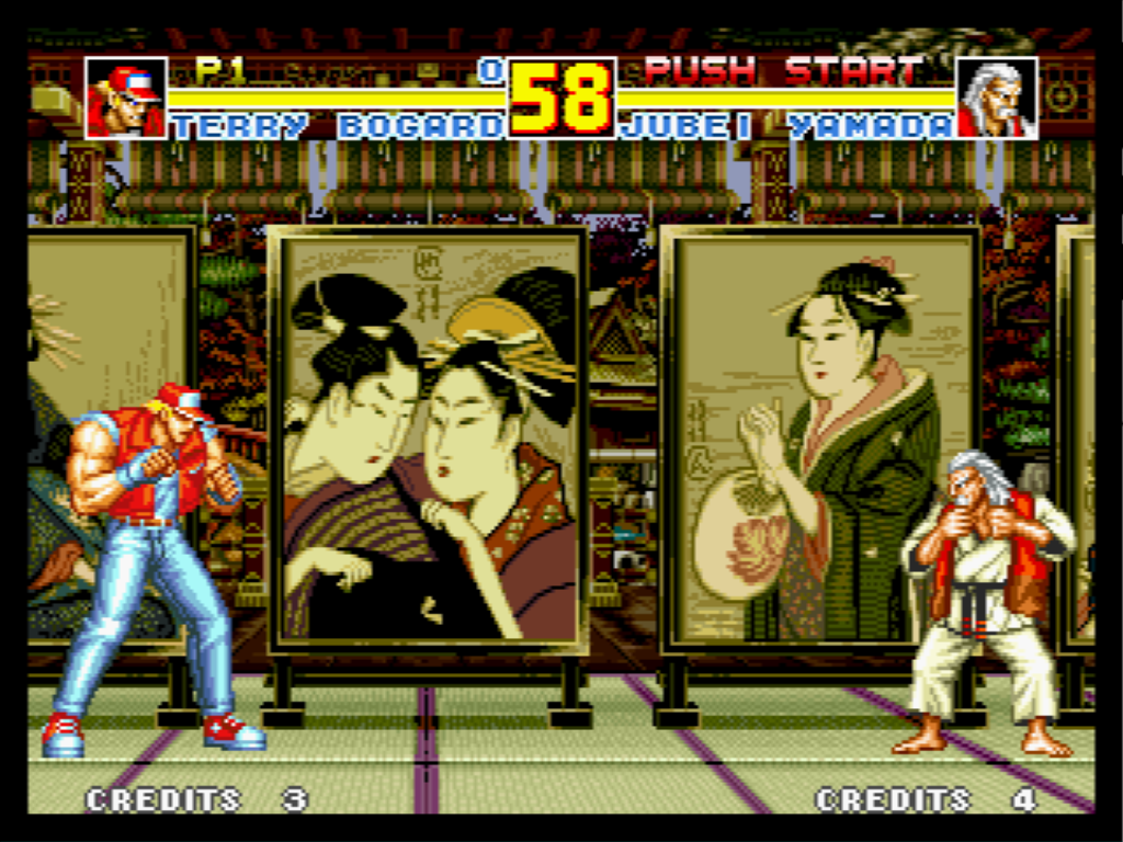 On peut le dire d'emblée : la saga Fatal Fury, sur Neo Geo en tout cas, n'est pas une saga de jeux de versus fighting ordinaires, et cet opus "special" n'y fait pas exception. Mais partons quand même du début : vous choisissez votre perso parmi une bonne quinzaine et vous partez à l'assaut du mode Arcade qui va vous mettre aux prises avec les autres combattants jusqu'au Boss final, j'ai nommé Krauser (le Dark Vador doré, alors fait gaffe Ryoups). Au niveau des commandes, c'est assez classique, vous avez deux coups légers et deux coups lourds, ainsi que la possibilité de provoquer votre ennemi. Le déroulement des combats est lui aussi classique, car il est découpé en rounds qu'il faut gagner pour avancer. Mais Fatal Fury Special tranche avec la concurrence sur un point, le combat est en 2D, mais sur deux plans du décor, et il faut que les persos soient sur le même plan pour se toucher (Arrête de taper dans le vide Kennouille !). D'ailleurs, on peut faire une attaque de changement de plan pour blesser son adversaire lorsqu'on le rejoint, ce qui est assez original.
