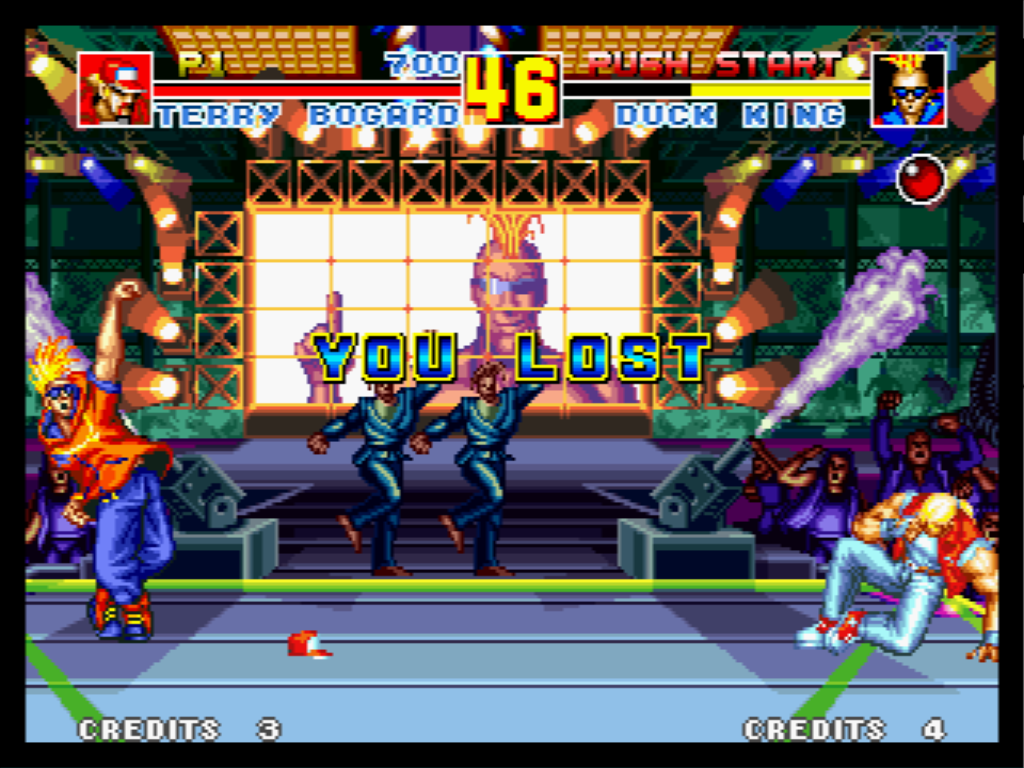 Du côté de la jouabilité c'est un peu mitigé. Non pas que les commandes répondent mal, loin de là, c'est plutôt au niveau de la difficulté que c'est assez rageant. Rappelons le : Fatal Fury Special est un jeu Pré-KOF, et il est cent fois plus dur et moins bien équilibré que le premier KOF (j'ai nommé King of Fighters 94). C'est en effet le problème de SNK qui fait des jeux d'arcade à l'extrême limite de l'infaisable, et ce même en facile. C'est en rebondissant là-dessus qu'on arrive à la durée de vie, qui dépend de votre capacité à vous retenir de faire un Rage-Quit. En effet le tournoi est raisonnablement long, mais il vous faudra beaucoup de patience et d'adresse pour arriver jusqu'à Krauser... et il vous en faudra encore plus pour le battre (Allez Ryoups, tu sors de cette machine à laver et t'y retournes !). C'est vrai que pour ma part, une telle gestion de la difficulté m'agace, en effet je joue pour me détendre, pas pour piquer une crise et faire passer mon PC dans un broyeur à papier... et surtout dès le premier combat du tournoi.