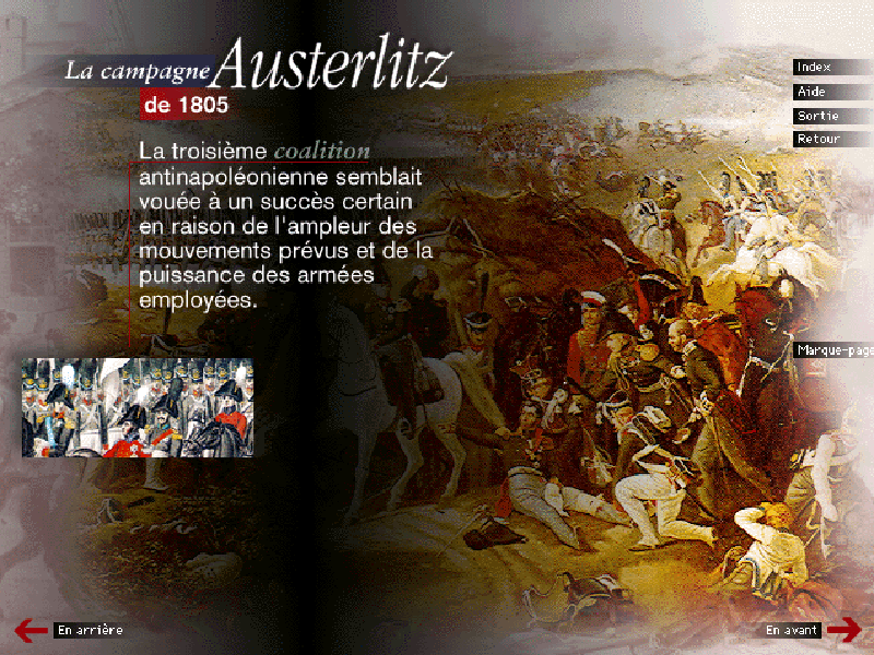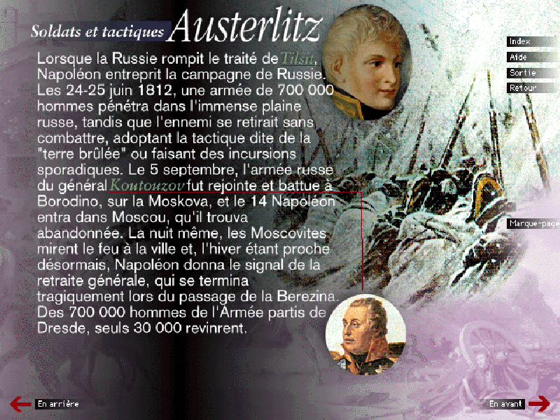 ConclusionRichement illustré d’images, de textes et de commentaires, ce CD-Rom passionnera, à travers ces récits de batailles, les personnes voulant comprendre les stratégies militaires à travers les siècles.