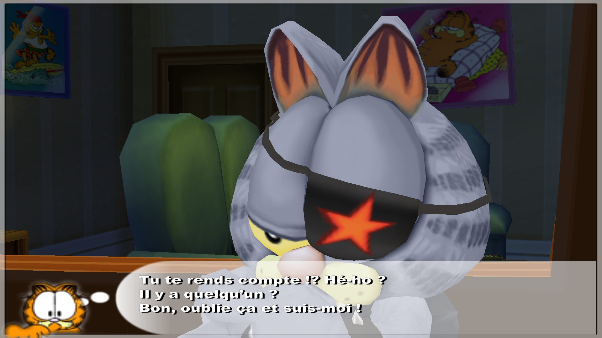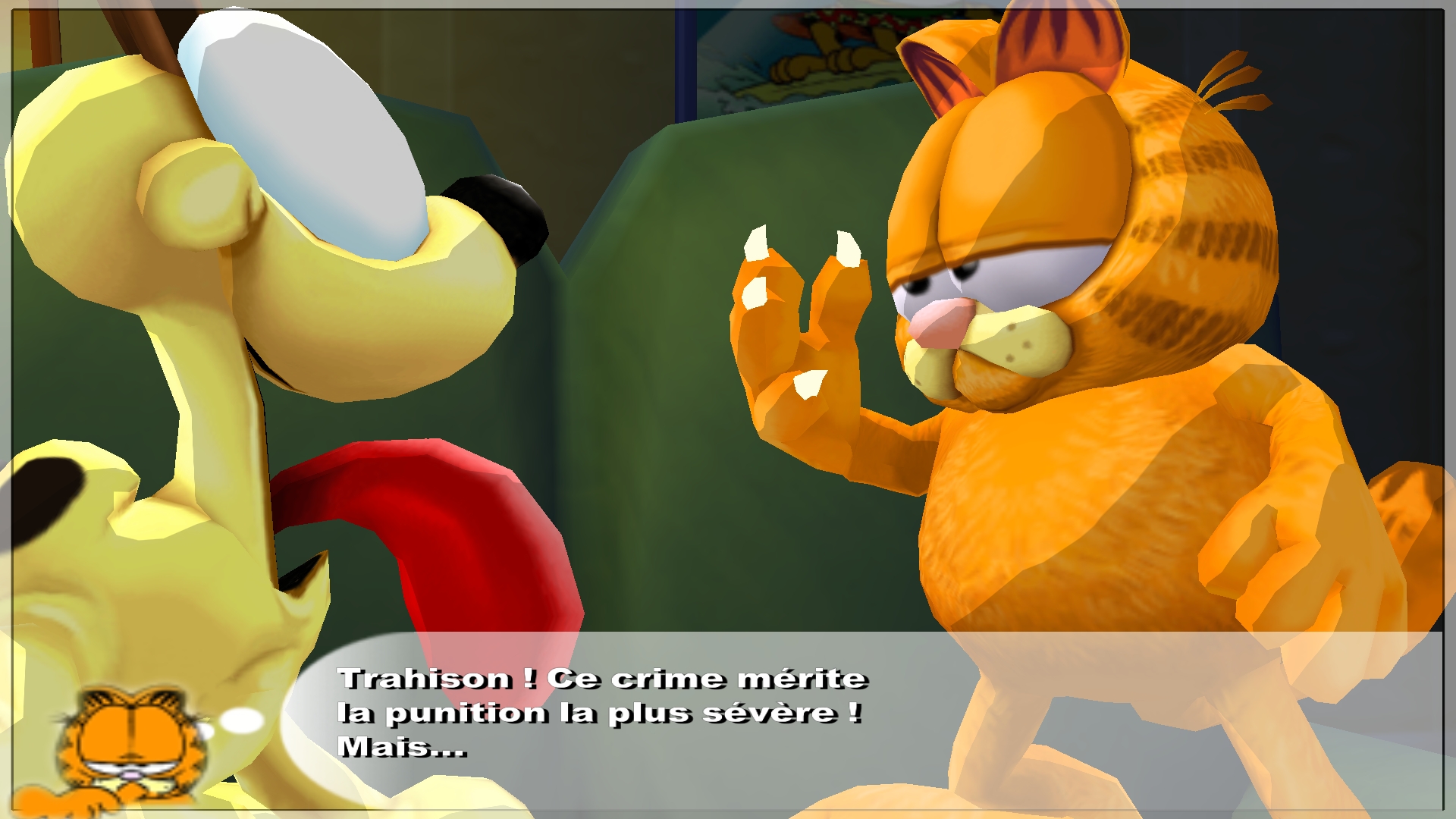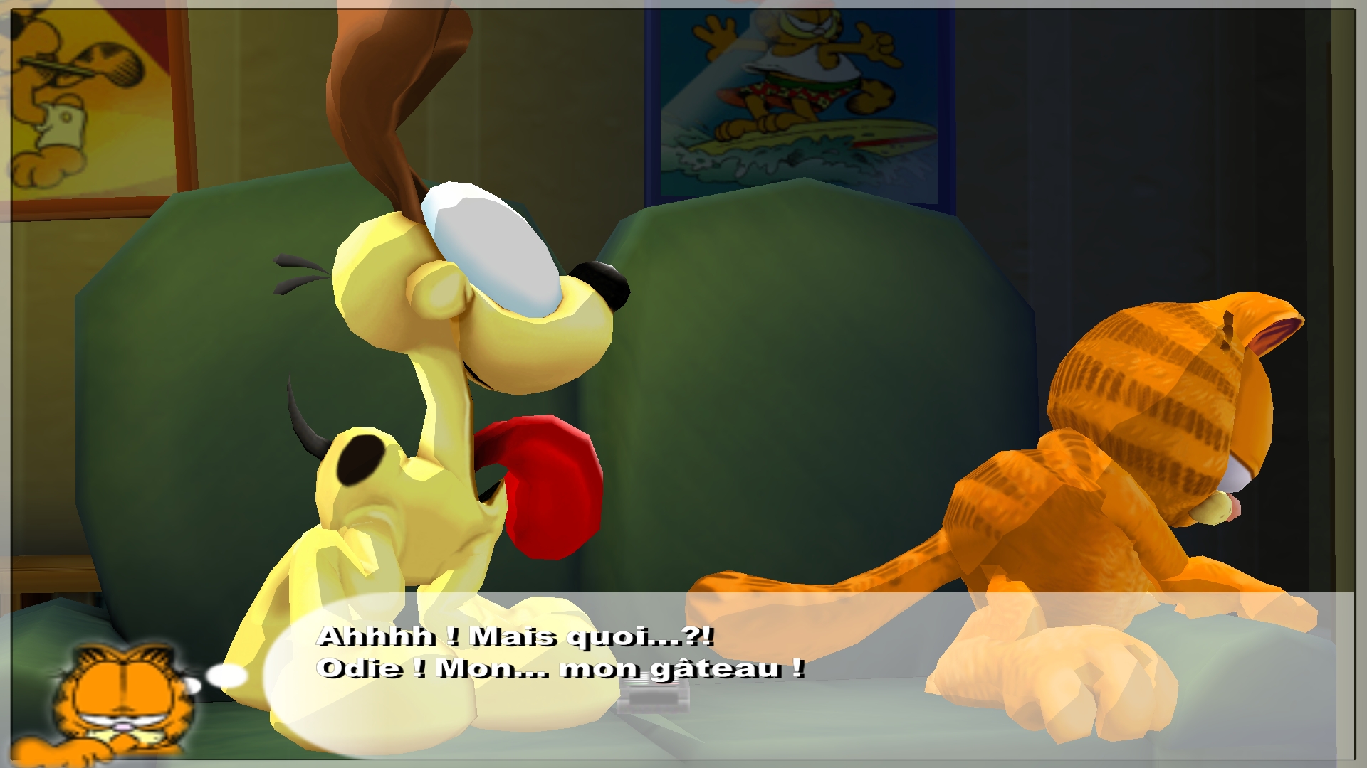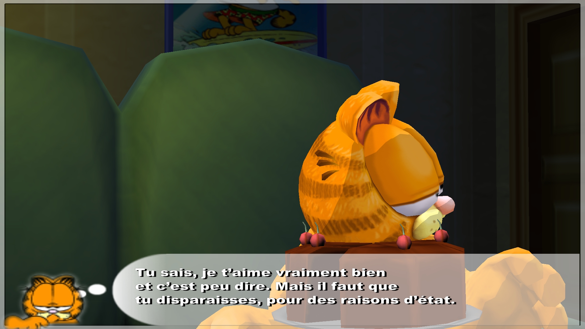 Concernant les bruitages et les sons d’ambiance, ceux-ci sont toujours aussi réussis et contribuent à immerger le joueur dans l’aventure. Au niveau des voix en revanche, si Sauver Arlène ne brillait pas par sa version française, Lasagna World Tour est encore pire de ce point de vue. L’acteur incarnant Garfield semble en effet n’avoir ni la voix pour incarner le gros chat orange (en tout cas, il est très loin de l’acteur qui l’incarne dans le dessin-animé de 1982) ni l’entrain et la motivation pour jouer correctement son rôle. De plus, le chat gris qui joue le méchant de l’histoire (car oui, il y a bien un antagoniste dans cette aventure) n’a même pas de voix et ne communique que de façon non-verbale, rendant pour le joueur difficile la tâche de s’attacher ou de détester le vilain de l’histoire. Très dommage donc que le titre ne bénéficie pas d’acteurs talentueux pour incarner les différents personnages, aussi simple l’histoire soit-elle.