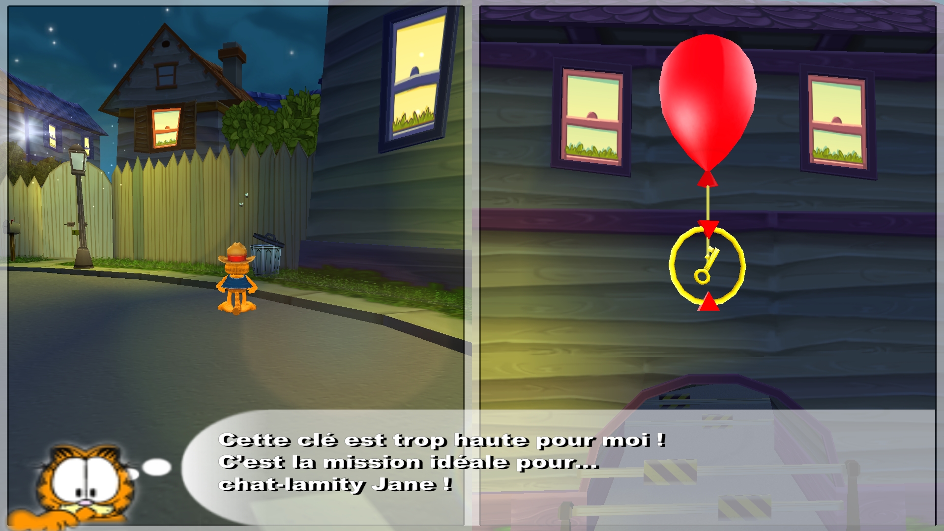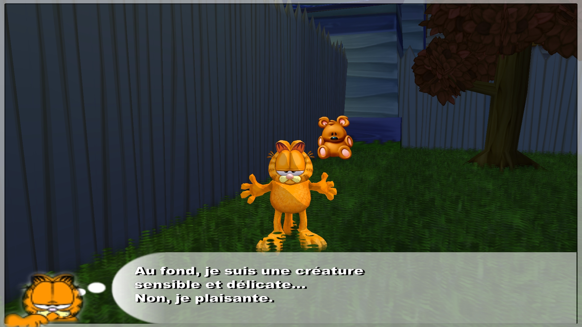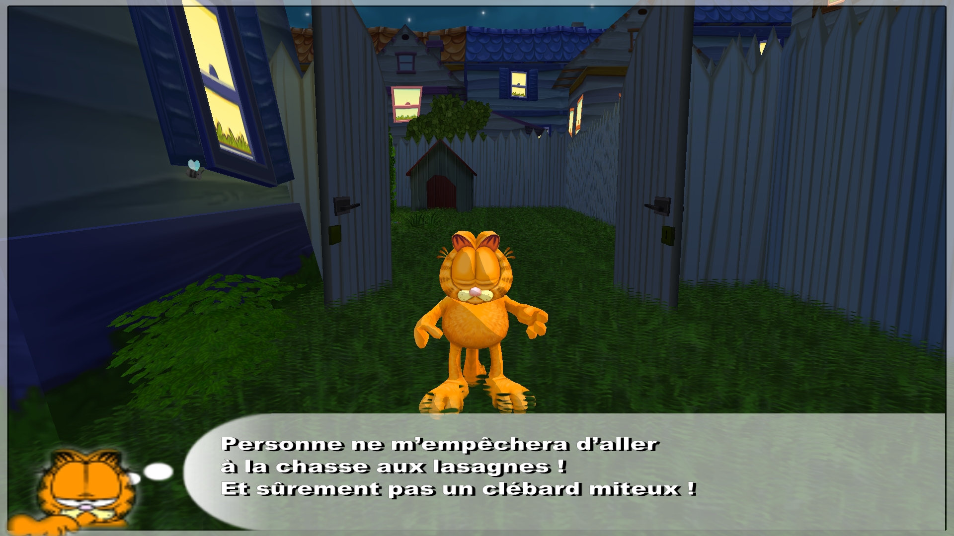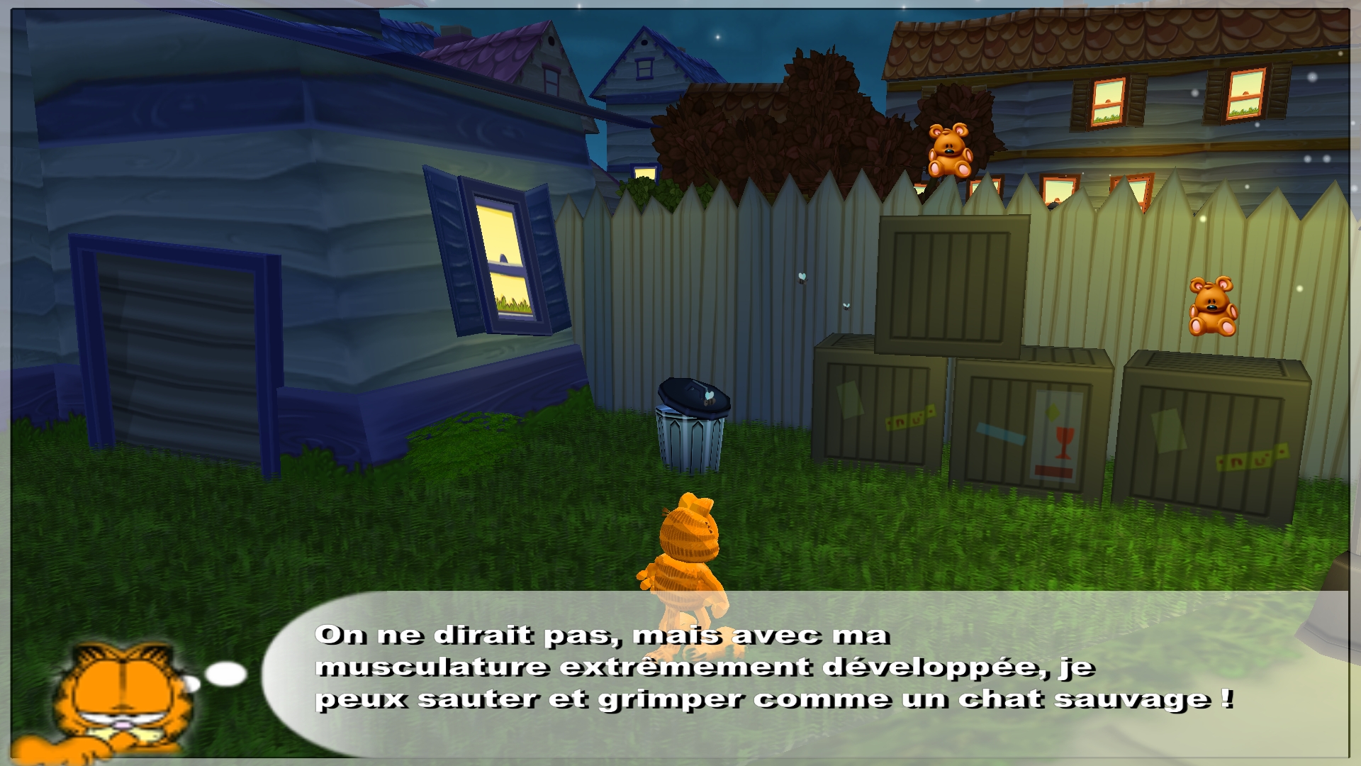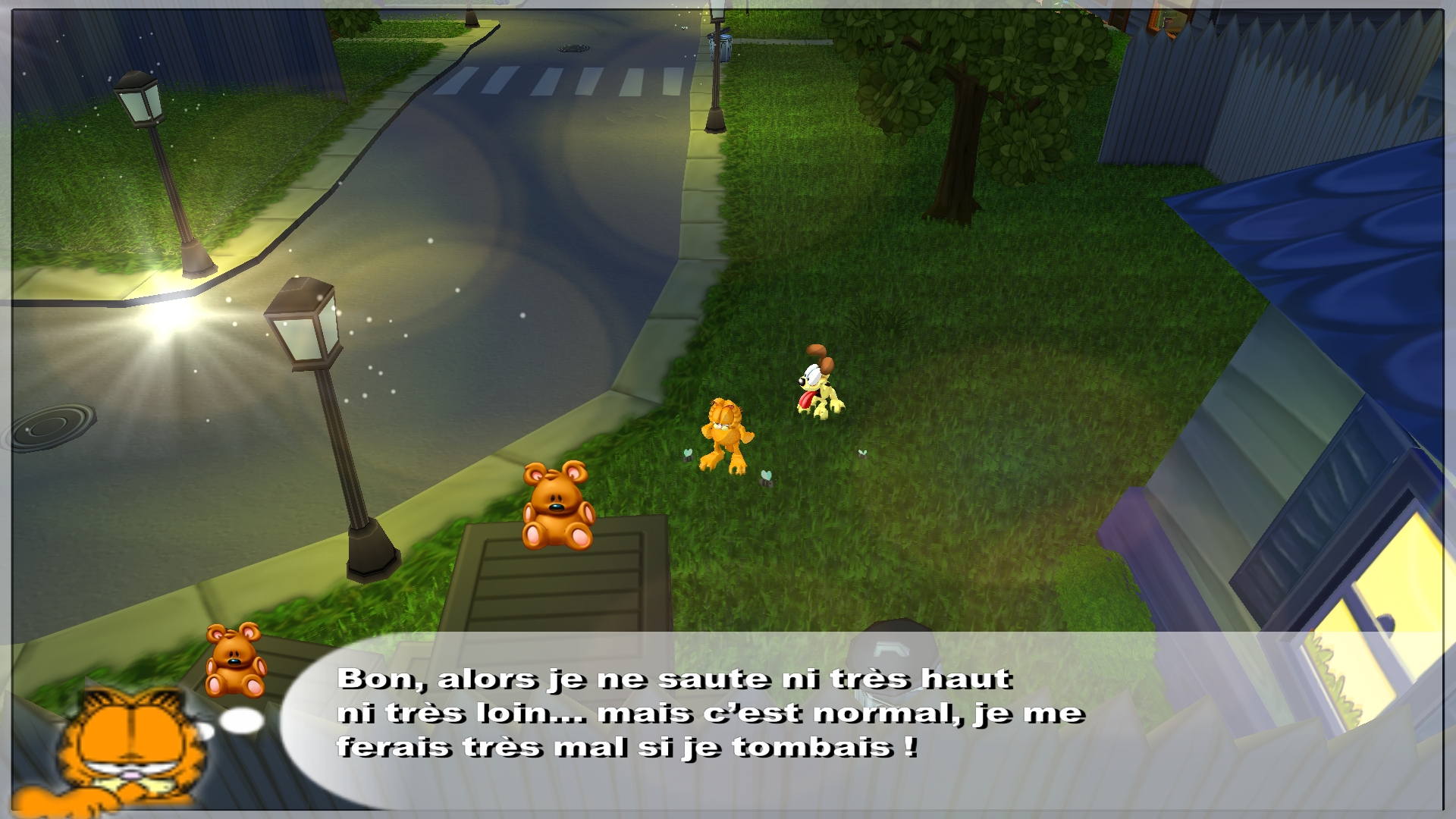 Concernant les bruitages et les sons d’ambiance, ceux-ci sont toujours aussi réussis et contribuent à immerger le joueur dans l’aventure. Au niveau des voix en revanche, si Sauver Arlène ne brillait pas par sa version française, Lasagna World Tour est encore pire de ce point de vue. L’acteur incarnant Garfield semble en effet n’avoir ni la voix pour incarner le gros chat orange (en tout cas, il est très loin de l’acteur qui l’incarne dans le dessin-animé de 1982) ni l’entrain et la motivation pour jouer correctement son rôle. De plus, le chat gris qui joue le méchant de l’histoire (car oui, il y a bien un antagoniste dans cette aventure) n’a même pas de voix et ne communique que de façon non-verbale, rendant pour le joueur difficile la tâche de s’attacher ou de détester le vilain de l’histoire. Très dommage donc que le titre ne bénéficie pas d’acteurs talentueux pour incarner les différents personnages, aussi simple l’histoire soit-elle.