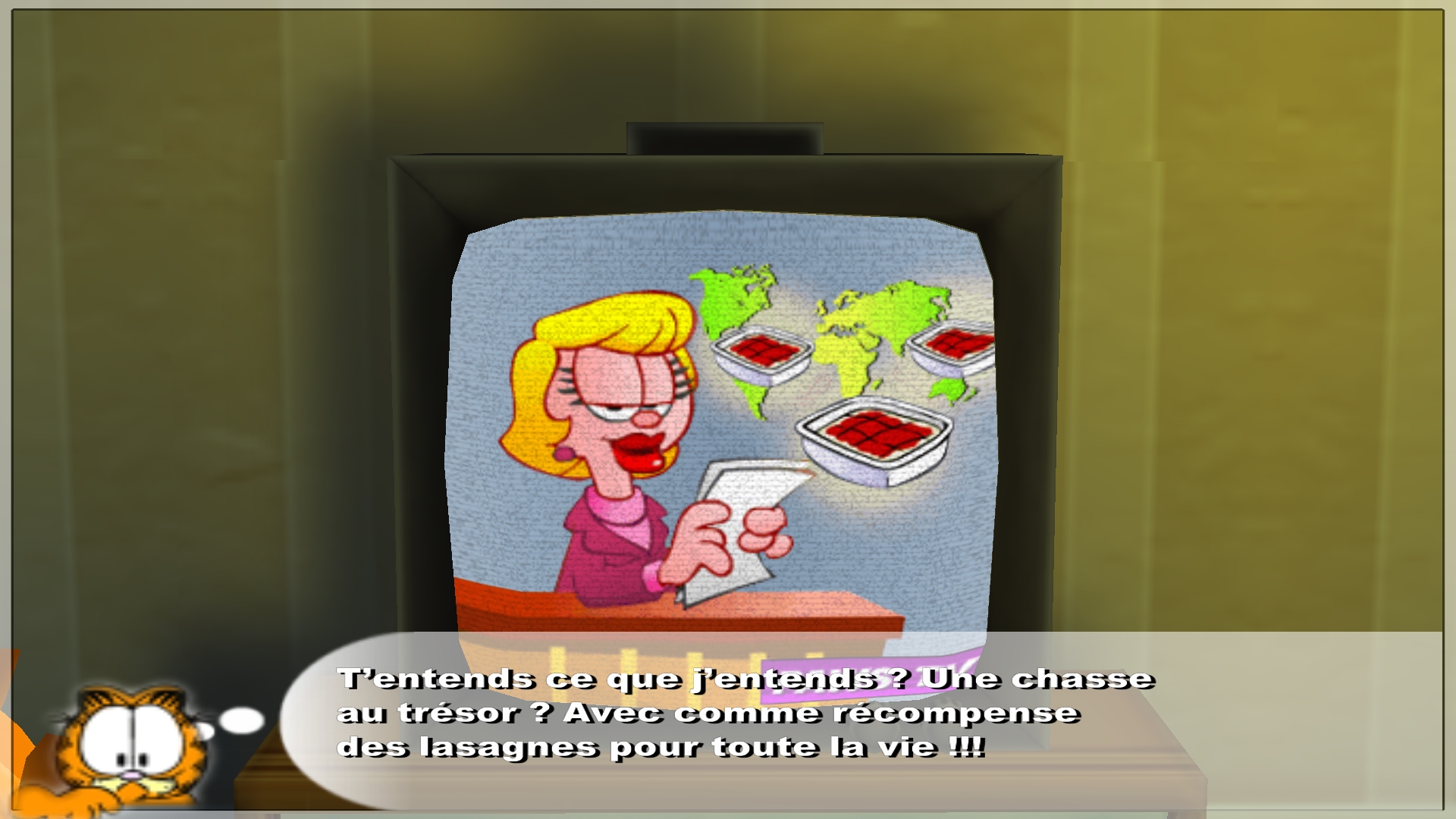 L’aventure commence alors que comme dans le jeu précédent (ainsi que dans les deux jeux antérieurs), Garfield se prélasse et roupille devant la télévision. Encore réveillé par Odie, le matou grincheux va une nouvelle fois s’en prendre à lui. Mais cette fois-ci, avant d’avoir pu lui coller une baffe, l’attention de Garfield est attirée par un jeu concours à la télévision : une grande chasse aux trésors dont la récompense est un approvisionnement à vie en lasagnes. Il n’en faut pas plus pour que le gros chat orange, d’ordinaire fainéant et casanier, sorte de sa zone de confort et parte avec Odie à la recherche des indices qui lui permettront de remporter la chasse aux trésors et donc de pouvoir s’empiffrer à vie.