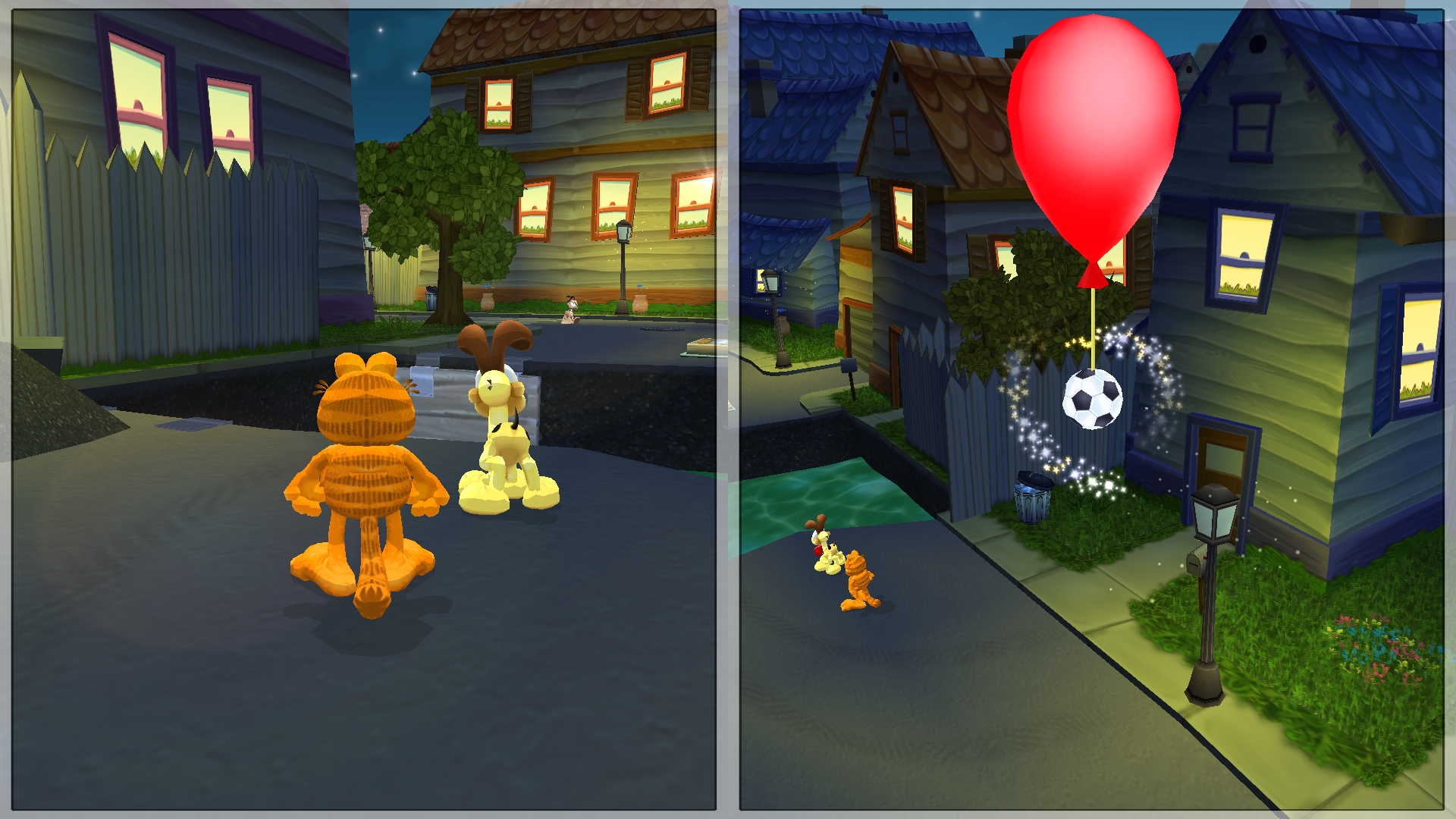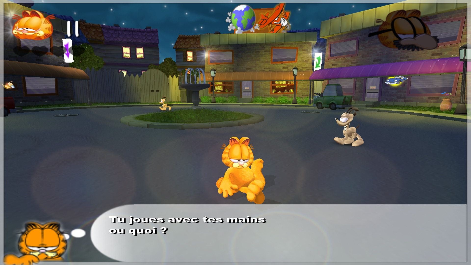 En effet, Garfield : Sauver Arlene était un titre amusant, avec une histoire touchante, des mécaniques de jeu simples mais intelligentes, des graphismes somptueux, une bande-son de qualité et une bonne dose d’humour. C’est donc tout naturellement que Eko Software, cette fois-ci associé à Mindscape, l’éditeur original Hip Games ayant fait faillite, va développer cette suite directe à Sauver Arlène intitulée Garfield : Lasagna World Tour et sortie deux ans plus tard en 2007. Ce second opus a non seulement une histoire qui fait directement suite à celle de son prédécesseur, mais les moteurs physique et graphique ainsi que les mécaniques de jeu sont également reprises de Sauver Arlène. Alors, nouvel épisode convaincant ou pâle copie de son modèle ? C’est ainsi parti pour le test de Garfield : Lasagna World Tour, un titre qui fait la part belle au voyage.
