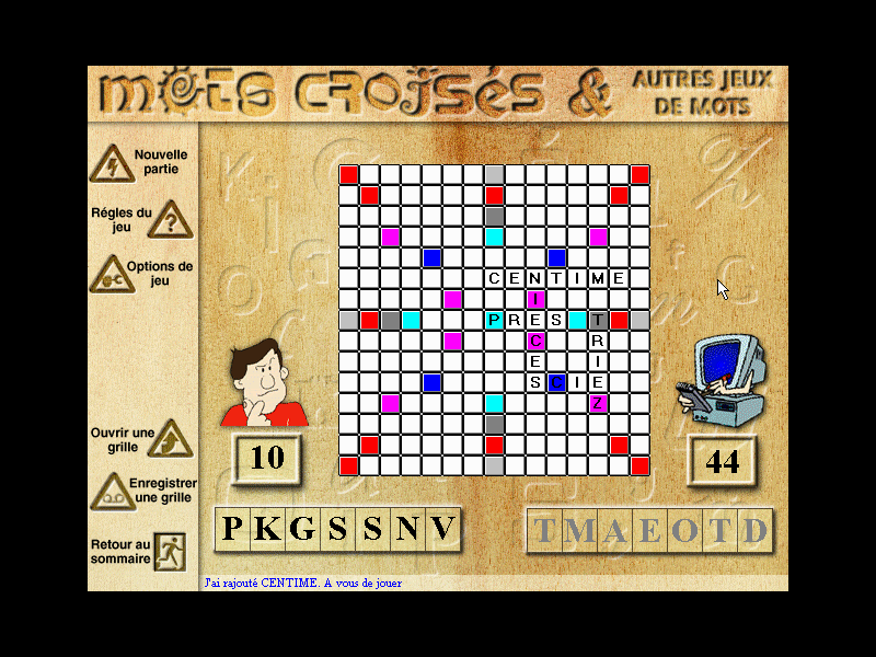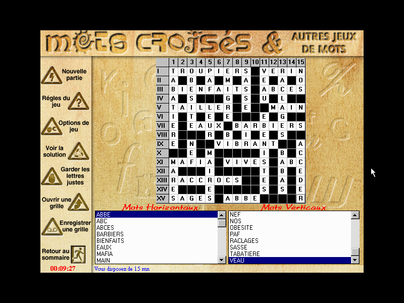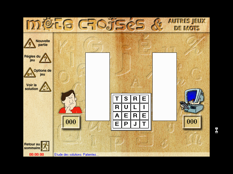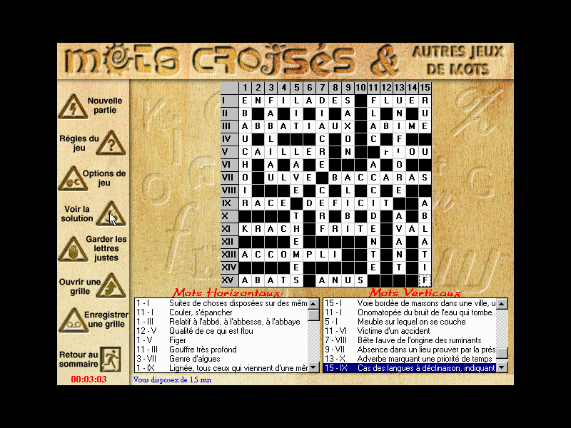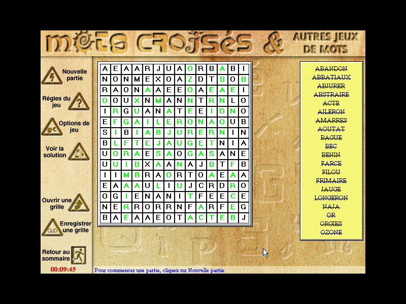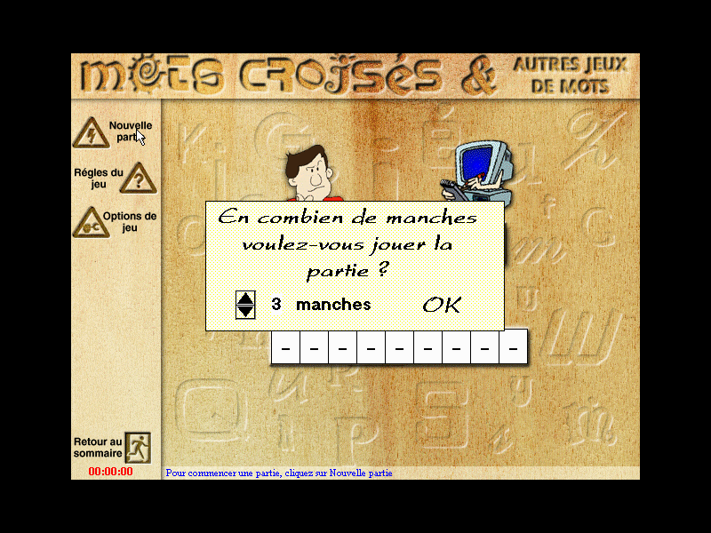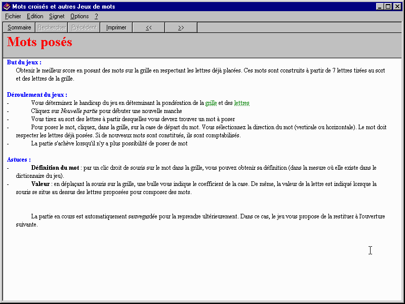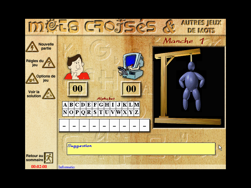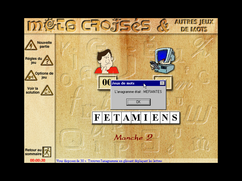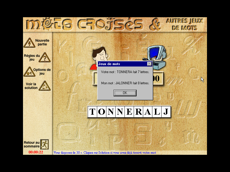 Quoi de neuf ?Tout d'abord, nous sommes un ou deux ans après Jeux de Mots (1996) car le copyright sur le CD-rom indique 1997, mais après l'installation, le titre affiche Mots croisés et autres jeux de mots 98 dans les programmes du menu "Démarrer" de Windows.