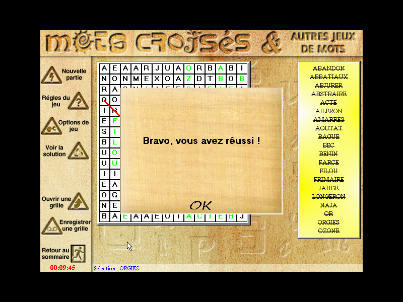 Même si le fond du décor est différent, l'écran d'accueil présente un lien pour chaque jeu disponible, comme le titre précédent, mais au nombre de neuf cette fois-ci. On retrouve le Pendu qui fonctionne à l'identique, il faut toujours placer les lettres au bon emplacement dans le mot. Nouveauté: un mode de difficulté intermédiaire est apparu mais mal implémenté. En effet, il y a les choix Facile, Normale ou Difficile, mais c'est le mode Normal le plus facile ! Le Mot le plus long, Anagramme et Mots Barrés se décrivent à eux-mêmes, mais j'ai noté l'ajout du choix d'un thème et la possibilité, à présent, de choisir la durée de réflexion pour tous les jeux.