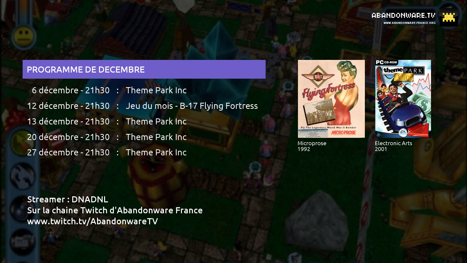 Vous trouverez en plus le replay de la soirée Twitch qu'on a passé en compagnie de DNADNL ce dimanche 6 décembre, un Let's Play de Theme Park Inc.
