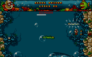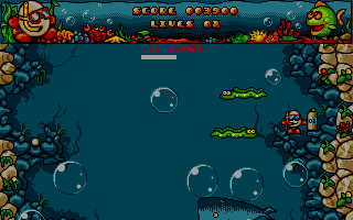 Dizzy a plongé pour aller chercher des perles, mais c'est un oeuf et il a coulé. Le but du jeu est simple : remonter à la surface en se faisant porter pas des bulles avant de manquer d'oxygène. Les bulle apparaissent aléatoirement et ont une durée très limitée lorsque vous êtes dessus. lorsqu'elles éclatent, vous redescendez, le but étant de trouver un support ou une autre bulle. une astuce constitue à sauter avant que la bulle n'éclate, pour monter un peu plus haut, mais il faut le faire au bon moment, en effet, sauter a pour effet de faire éclater la bulle. Vous pouvez prendre appui sur les rochers, ou sur les baleines (inoffensives). Vous pouvez aussi ramasser les diamants et les perles ainsi que des bouteilles d'oxygène (qui ont pour effet de remplir votre réserve d'air). Le nombre de perles ramassées vous donnera plus ou moins de bonus une fois à la surface. J'allais oublier : vous devrez éviter les méduses, crabes, requins, pieuvres et autres sales bêtes, tout contact fait diminuer votre réserve d'air.