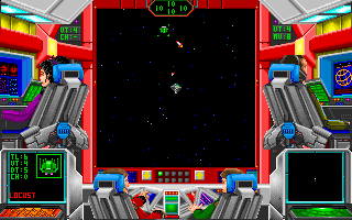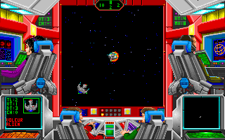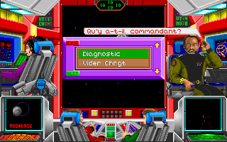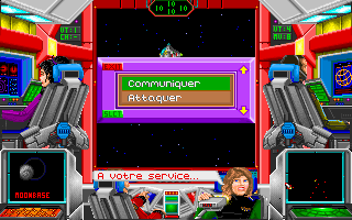 - Une fois votre vaisseau envoyé dans l'espace, vous êtes sur le pont de votre vaisseau, et chaque membre d'équipage a son rôle (ils proposent des options différentes). Le déplacement du vaisseau et les combats se déroulent en temps réel (flèches gauche et droite pour tourner, flèches haut et bas pour la vitesse, boutons gauche et droite de la souris pour tirer avec l'arme 1 ou 2 (le curseur doit être sur l'ennemi)).