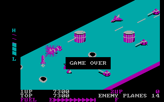 Et voilà un de grands classiques des débuts du jeu video, un dont ceux qui ont eu une console Colecovision vous parlent encore avec des étoiles dans les yeux : Zaxxon. On peut décrire ce jeu comme un banal shoot them up, mais Zaxxon a eu la chance d'être un des premiers jeux à proposer la 3D (isométrique il est vrai) dans ce style. Une véritable révolution qui a permis à son nom de traverser les générations ! Il vous faudra guider l'avion au travers des lignes de défenses posées par Zaxxon, afin de l'atteindre et pouvoir l'abattre. Et recommencer...