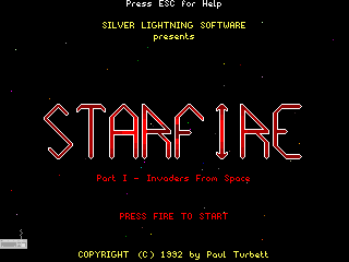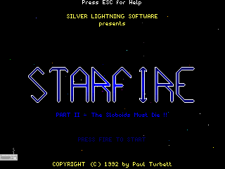 Représenté sous la forme d'un shoot'em'up (on le saura) vertical, Star Fire vous met aux commandes d'un de ces super vaisseaux super équipé! Vous aux commandes, la touche 'ESPACE' pour tirer, et les flèches pour vous diriger, vous devrez canarder tout ce qui bouge, en évitant les tirs ennemis ! Des options pour vous aider, en passant de l'upgrade de vos armes, du bouclier d'invincibilité temporaire, mais aussi des vies et des bonus de régénération de votre bouclier, vous devrez faire en sorte d'aller le plus loin possible, certes, mais aussi de figurer dans le top score grâce à vos actions sur le terrain! Dans l'espace ou sur Terre, 2 champs de bataille plutôt vastes...