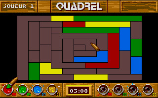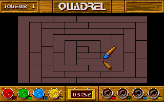 Quadrel est un jeu de réflexion au principe très simple. Un tableau est divisé en cases, vous devez colorier les cases avec les quatre couleurs disponibles, en respectant une seule règle : deux case adjacentes ne peuvent pas être de la même couleur. Simple, non ? Bon, pour compliquer un peu, pour chaque tableau, la quantité disponible de chaque couleur est limitée, que faire quand on a besoin de bleu et qu'on n'en a plus ?