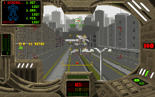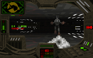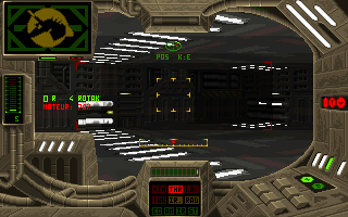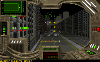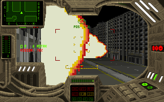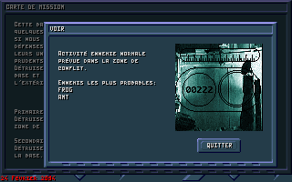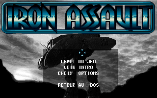 RéalisationC'est là que ça fait mal, Iron Assault était un projet ambitieux, mais qui manque cruellement de moyens. En 1995, alors que Mechwarrior 2 est en full 3D SVGA, Iron Assault a des graphismes dignes de Doom : décors en 3D VGA mais ennemis sous forme de sprites. Côté son, si les bruitages sont corrects, la musique Sound Blaster Pro est largement en retrait de ce qui se faisait à l'époque. Mais le pire reste les cinématiques, comment dire ? Un an avant, Wing Commander III nous avait habitué au grand spectacle des videos filmées, d'autres jeux était restés à l'animation dessinée mais fluide... Mais Iron Assault possède des cinématiques qui valent le détour : elles sont filmées, mais dans une qualité horrible, qui n'arrive même pas à masquer la pauvreté des effets spéciaux.