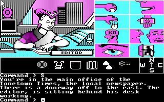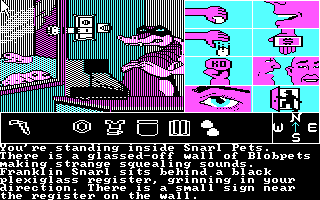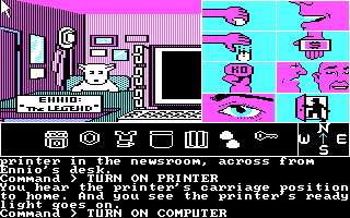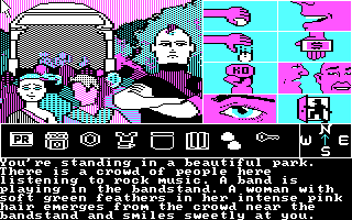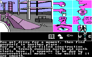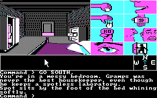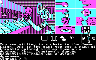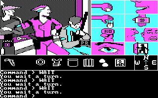 La seconde est plus inhabituelle pour un jeu d'aventure : au joystick. Là vous allez utiliser les icones présents sur le côté droit de l'écran, leur signification étant assez claire (regarder, boire, parler...), puis sur l'objet ou la personne concerné à l'écran. L'inventaire se trouve dans la barre horizontale située sous l'image.