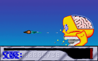 Breakfast, shower, and shootingSean Wachob (et cie), ont développé en 1992 un nouveau jeu : XAP. Derrière ce nom plutôt étrange (avec lequel je vous laisserai voguer à toute imagination personnelle) se cache un shoot'em'up horizontal, un genre qui commence à bien se répandre à cette époque. Histoire inconnue à l'heure actuelle, XAP c'est : un vaisseau qui vole, des ennemis qui en raffole, et un gun pour tout dégommer. Classique quoi. A travers 4 niveaux (ici disponibles), vous devrez vous frayer un chemin parmi les vagues de robots et d'aliens qui rappliquent sur tout l'écran, en évitant les tirs, et en faisant mouche pour augmenter le score. Attention à la barre de vie qui dégringole au fur et à mesure des contacts avec les ennemis. Les différents niveaux se déroulent un peu à la manière de Thunder Force 4 sur Megadrive (pour ceux qui connaissent), c'est-à-dire que le vaisseau peut se déplacer sur tout l'écran, mais il est aussi possible de faire descendre le niveau à la verticale : les zones de jeu deviennent plus vastes, et c'est un petit plus qui prime pour l'originalité, même si cette caractéristique n'est pas (encore ?) bien justifiée niveau jeu. En effet, le plus gros des ennemis se situe dans la zone supérieure principale, laissant plus désertique la partie basse.
