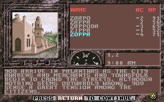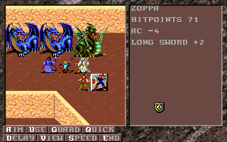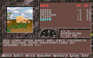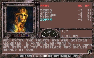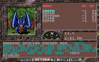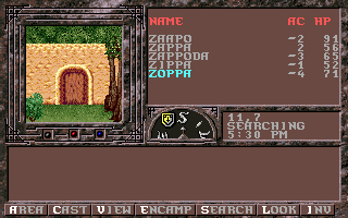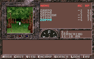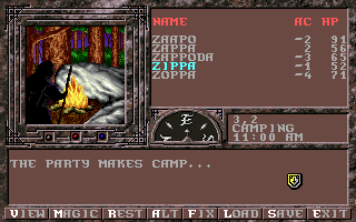 Le gameplayLe jeu reprend le même principe que ses prédécesseurs dans la série : une vue subjective dans la fenêtre de visualisation, à côté de laquelle on va trouver la liste des personnages et de leur caractéristiques principales. Une boussole vous indiquera la direction vers laquelle vous faites face, et quelques informations (localisation, état du groupe et heure) sont visibles aussi. Enfin, on a en dessous quelques commentaires, ainsi que diverses actions possibles, dont l'accès à une mini-carte, à la mémorisation des sorts ou le repos des membres du groupe dans un camp de fortune.