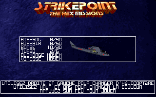 RéalisationTechniquement, StrikePoint est une réussite, les graphismes fins et détaillées acceptent des résolutions allant du 320x200 au 1280x1024 256 couleurs tout en restant bien fluide.