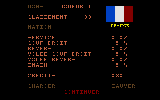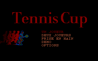 PrésentationEn 1989, Great Courts s'est immédiatement imposé comme le meilleur jeu de tennis sur micro, et il n'allait pas être facile de lui ravir ce titre. Loriciel a cependant tenté sa chance avec Tennis Cup l'année suivante. Ce programme tire son intérêt de sa mise en scène : au lieu de présenter le court de manière télévisuelle, avec un tennisman au premier plan et l'autre au fond, l'écran est coupé en deux dans le sens horizontal, avec une partie pour chaque tennisman. Les deux joueurs sont ainsi placés sur un pied d'égalité, avec le même champ de vision, mais on ne voit plus les balles en hauteur, et le fond du court est exigu. Il ne semble pas possible de choisir le type de frappe, il faut se placer précisément à l'endroit où la balle va passer et appuyer sur le bouton de tir ('ENTREE' au clavier) au bon moment, avec la direction du tir. Le test de collision est sévère, il est vraiment difficile de renvoyer les balles qui partent sur les côtés. C'est l'entraînement qui fera la différence, car le joueur a des pourcentages de performances qu'il peut améliorer et qui augmenteront la qualité de ses frappes. Autre avantage que n'a pas Great Courts : le jeu en double.