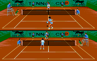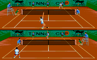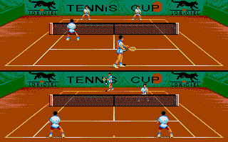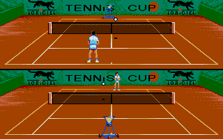 En 1989, Great Courts s'est immédiatement imposé comme le meilleur jeu de tennis sur micro, et il n'allait pas être facile de lui ravir ce titre. Loriciel a cependant tenté sa chance avec Tennis Cup l'année suivante. Ce programme tire son intérêt de sa mise en scène : au lieu de présenter le court de manière télévisuelle, avec un tennisman au premier plan et l'autre au fond, l'écran est coupé en deux dans le sens horizontal, avec une partie pour chaque tennisman. Les deux joueurs sont ainsi placés sur un pied d'égalité, avec le même champ de vision, mais on ne voit plus les balles en hauteur, et le fond du court est exigu. Il ne semble pas possible de choisir le type de frappe, il faut se placer précisément à l'endroit où la balle va passer et appuyer sur le bouton de tir ('ENTREE' au clavier) au bon moment, avec la direction du tir. Le test de collision est sévère, il est vraiment difficile de renvoyer les balles qui partent sur les côtés. C'est l'entraînement qui fera la différence, car le joueur a des pourcentages de performances qu'il peut améliorer et qui augmenteront la qualité de ses frappes. Autre avantage que n'a pas Great Courts : le jeu en double.