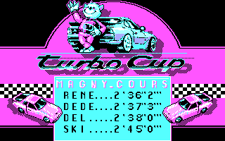 PrésentationBienvenue dans la Porsche 944 turbo, un nom qui en a fait rêver plus d'un. Vous allez de plus pouvoir la piloter sur des circuits dont les noms parleront aux amateurs de sports mécaniques : Magny-Cours, Dijon-Prenois, Nogaro ou le Paul Ricard du Castellet. Si le premier et le dernier sont célèbres pour avoir accueilli les Grands Prix de France de Formule 1, les autres ont été le théâtre d'épreuves diverses et variées, tel que du superbike, ou d'épreuves d'endurance. Vous allez de plus vous lancer dans de véritables compétitions, avec un tour d'essai suivi d'une course, afin de prouver votre virtuosité au volant. Et attention, bien sûr, meilleur est votre temps pendant le tour de qualification, meilleur sera votre placement sur la grille de départ.