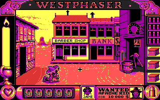 Le jeuPour qui a déjà été au stand de tir d'une foire, ou qui s'est déjà essayé à certaines scènes de Blade Runner (le jeu), West Phaser ne recèlera aucune surprise. Pour les autres, un petit résumé : des cibles se présentent face à vous, à une distance plus ou moins lointaine, et il va falloir les atteindre avec vos balles. Cala sera plus ou moins facile, car certaines d'entre elles ont une vitesse élevée, et vous n'aurez que faire de trop de réflexes pour espérer les mettre à terre. Attention cependant, car il y a des innocents qui passent tranquillement, enfin, aussi tranquillement qu'on peut le faire au milieu d'une fusillade. Et pour récupérer de l'énergie, des munitions, ou gagner plus d'argent, il faudra atteindre les petits voleurs se faufilant un peu partout.