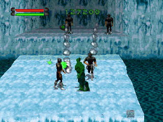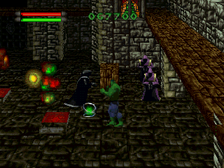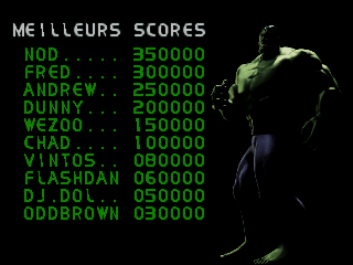 PrésentationAlors que Batman et Spiderman ont plusieurs fois été à l'honneur dans des jeux sur micro, Hulk avait été plutôt délaissé. The Incredible Hulk : The Pantheon Saga répare cet affront dans un jeu de baston qui, à première vue, donne l'impression d'avoir été publié par Acclaim. Les personnages au look digitalisé (le géant vert a été modélisé sous Silicon Graphics) et le grand nombre de coups rappellent fortement Batman Forever, avec cette fois une plus grande liberté de mouvement. Imaginez un lointain successeur de Double Dragon dans lequel les personnages et le scrolling ne seraient pas systématiquement orientés vers la gauche ou la droite, mais aussi vers l'arrière-plan et le premier plan, et où on pourrait se déplacer librement dans des décors en relief (escaliers, plateformes mouvantes...). Les décors utilisent à peu près la même technique que dans Doom et grossissent ou rapetissent selon leur distance à l'écran, cela donne des effets de profondeur assez réussis.