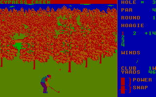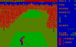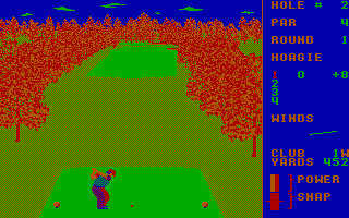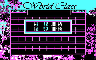 PrésentationWorld Class Leader Board est la suite de Leader Board (1986). C'est la seule chose dont on peut être sûr, car la chronologie de la série est assez confuse. Après les versions 8 bits de Leader Board qui étaient très dépouillées (aucun décor sur le green), les conversions sur Amiga et Atari ST ont intégré des arbres et des haies. En 1987 sort ensuite World Class Leader Board, avec des décors plus fouillées. La version PC (qui affiche simplement "World Class" sur l'écran de titre) est à la traîne, car comme les versions 8 bits, elle utilise l'interface de Leader Board alors que les version ST et Amiga ont droit à une nouvelle interface. Les graphismes sont en CGA et restituent assez mal l'atmosphère d'un green. Encore un peu plus tard, en 1989, une dernière version sort pour PC, toujours avec l'ancienne interface, mais avec le bon titre, des graphismes EGA bien plus convaincants, et le procédé RealSound qui joue des voix digitalisées sur le haut-parleur interne du PC. Cela commence enfin à ressembler à un jeu de golf digne de ce nom !