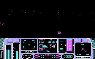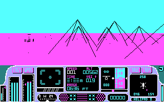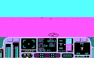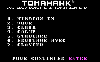 PrésentationTomahawk est un des premiers jeux écrits par Digital Integration. C'est un simulateur d'hélicoptère qui tente de reproduire le pilotage des ces appareils : poussée des moteurs ('A' et 'Q'), variation d'altitude ('Z' et 'S') et rotation latérale ('W' et 'X'). Le paysage est très limité, sans relief autre que quelques pyramides transparentes qui font office de montagne. Tout crash se solde immédiatement par un plantage du programme ! Au moins, il y a quatre missions jouables de jour comme de nuit, mais Tomahawk ne fera guère le poids quand Gunship sortira.