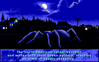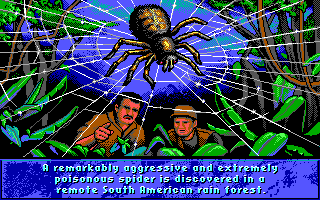 "Arachnophobie" était le premier film de Hollywood Pictures, la société de production de la Walt Disney Company destinée aux films orientés "adultes" qui n'a pas fait franchement dans la qualité, loin de là ("California Man", "Super Mario Bros", "Color of Night", "Terminal Velocity", "Judge Dredd", "Les Visiteurs en Amérique"... On arrête là, ou il vous en faut d'autres ?). Pour bien marquer le coup, rien de tel qu'une adaptation vidéoludique éditée par Disney Software. Et comme Disney Software n'a aucune structure de développement et fait tout écrire par des studios externes, c'est BlueSky Software, déjà auteur de Hare Raising Havoc, qui s'est chargé du boulot. Le thème rappelle sensiblement celui de It Came From the Desert, on pouvait donc en tirer un bon jeu. C'est plutôt raté ! Après avoir trouvé une maison à "désinfecter" dans un écran qui fait fortement penser à Ghostbusters, votre nettoyeur entre dans une maison, et le massacre peut commencer. Les araignées sautillantes doivent être tuées à l'insecticide, et les nids avec une bombinette. Hélas, rien ne donne envie d'aller jusque là : les graphismes sont en EGA, le personnage est incapable de se baisser, il répond mal aux commandes et ne s'arrête pas facilement... Seule la bande-son sur Sound Source est bonne, mais comme presque personne n'avait de Sound Source... Arachnophobia a tout de l'adaptation écrite hâtivement pour tenter de surfer sur la sortie d'un film qui n'est de toute façon pas resté dans les mémoires.