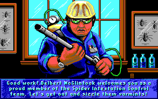 Présentation"Arachnophobie" était le premier film de Hollywood Pictures, la société de production de la Walt Disney Company destinée aux films orientés "adultes" qui n'a pas fait franchement dans la qualité, loin de là ("California Man", "Super Mario Bros", "Color of Night", "Terminal Velocity", "Judge Dredd", "Les Visiteurs en Amérique"... On arrête là, ou il vous en faut d'autres ?). Pour bien marquer le coup, rien de tel qu'une adaptation vidéoludique éditée par Disney Software. Et comme Disney Software n'a aucune structure de développement et fait tout écrire par des studios externes, c'est BlueSky Software, déjà auteur de Hare Raising Havoc, qui s'est chargé du boulot. Le thème rappelle sensiblement celui de It Came From the Desert, on pouvait donc en tirer un bon jeu. C'est plutôt raté ! Après avoir trouvé une maison à "désinfecter" dans un écran qui fait fortement penser à Ghostbusters, votre nettoyeur entre dans une maison, et le massacre peut commencer. Les araignées sautillantes doivent être tuées à l'insecticide, et les nids avec une bombinette. Hélas, rien ne donne envie d'aller jusque là : les graphismes sont en EGA, le personnage est incapable de se baisser, il répond mal aux commandes et ne s'arrête pas facilement... Seule la bande-son sur Sound Source est bonne, mais comme presque personne n'avait de Sound Source... Arachnophobia a tout de l'adaptation écrite hâtivement pour tenter de surfer sur la sortie d'un film qui n'est de toute façon pas resté dans les mémoires.
