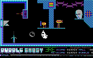 L'idée de base de Bubble Ghost est toute simple : un fantôme doit pousser une bulle à la sortie de chaque écran sans la faire éclater. Comme tout fantôme, il traverse le décor sans rien pouvoir toucher. Le seul moyen dont il dispose pour déplacer la buller est son souffle, qui peut aussi servir à désactiver certains objets. Tous les objets à l'écran sont dangereux pour la bulle, même les murs, et certains passages sont très étroits. Les ventilateurs la repoussent lorsqu'ils sont allumés. Heureusement, on peut s'entraîner sur n'importe quel niveau. La barre blanche en bas de l'écran qui sert de chronomètre n'est pas contraignante, elle ne sert qu'à calculer le score si on a terminé un niveau rapidement.