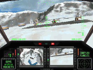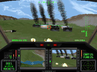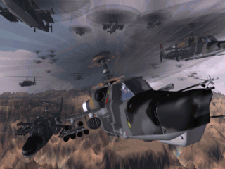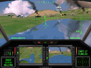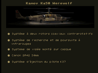 PrésentationWerewolf vs Comanche 2.0 est-il une simple version améliorée de Comanche : Maximum Overkill ou une véritable suite ? Ce qui est sûr, c'est qu'il s'agit de deux jeux en un. En effet, la boîte contient deux CD-ROMs, un pour le Comanche américain (la suite du jeu précité, d'où le "2.0" dans le titre européen) et le Werewolf russe. La principale nouveauté de Werewolf vs Comanche 2.0 est son orientation multijoueurs : une partie peut accueillir jusqu'à huit joueurs, par modem ou réseau local. Avec un exemplaire du jeu, on peut déjà s'affronter à deux, un sur chaque modèle d'hélicoptère. Avec un deuxième exemplaire, on peut jouer en équipe contre l'ordinateur ou affronter deux autres joueurs. Le moteur VoxelSpace n'a pas énormément évolué : meilleure gestion de la mémoire, quelques effets graphiques supplémentaires. Ce n'est plus aussi impressionnant que le premier épisode (trois ans se sont écoulés), les pixels au sol sont toujours aussi gros, mais au moins, cela ne nécessite pas un Pentium pour fonctionner, et sur un Pentium, l'animation est très rapide. Si on ajoute à cela le maniement très simplifié et accessible, Werewolf vs Comanche 2.0 est presque un Doom dans les airs. En solo, son intérêt est plus discutable...