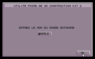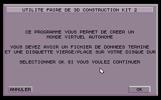 PrésentationLe logiciel 3D Construction Kit 2 est la suite d'un logiciel paru en 1991. En effet, 3D Construction Kit avait connu un beau succès. Flairant le filon, l'éditeur proposa un deuxième opus dans la foulée moins d'un an plus tard. Hormis des graphismes et des sons améliorés, il n'y a pas de révolution à attendre de ce titre.