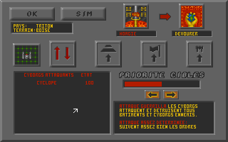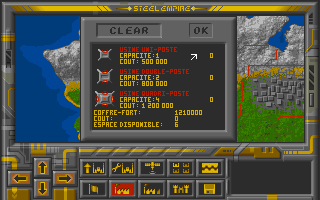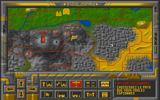 PrésentationSteel Empire est une sorte de "Risk" des temps modernes avec des cyborgs. Le scénario oppose deux à cinq camps, humains ou informatisés, sur une grande carte divisée en territoires. Lorsque vient son tour, un joueur peut envoyer une unité sur un territoire pour s'en emparer, construire une usine ou une forteresse sur un territoire qu'il possède déjà, et assigner la construction d'une unité à chacune de ses usines. Evidemment, plus on possède de territoires, plus le budget augmente. Les territoires contenant une ville produisent plus d'argent et sont donc particulièrement convoités. Les forteresses permettent de se protéger contre les offensives et d'affaiblir les unités attaquantes avant de leur envoyer des cyborgs. Les unités sont au nombre de neuf; plus elles sont puissantes, plus elles sont chères et nécessitent de tours pour être construites. Lorsqu'une unité entre sur un territoire ennemi, le combat commence. Si la partie a été configurée pour être stratégique, l'ordinateur détermine l'issue du combat en fonction des forces en présence. Dans le cas contraire, le combat donne lieu à une scène d'action. Chaque joueur a une moitié d'écran et dirige une unité au clavier.