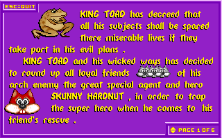ScénarioLe Roi Crapaud a décrété que les vies de tous ses misérables sujets seraient épargnées s'ils s'investissent à ses côtés dans ses plans diaboliques. Le Roi Crapaud rassemble tous les fidèles amis de son ennemi juré, l'agent spécial et héros Skunny Hardnut afin de le piéger. Ruminant ses mauvaises pensées, le Roi Crapaud sait que Skunny est sensible à la détresse du monde et au sort des otages. Pendant ses vacances aux Bahamas avec sa petite amie, le mannequin Rosie, notre héros apprend ce qui se passe et décide de jouer les appâts en emmenant sa chérie avec lui.