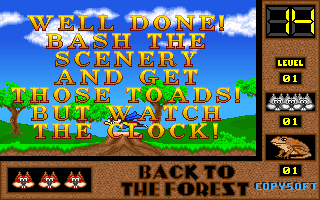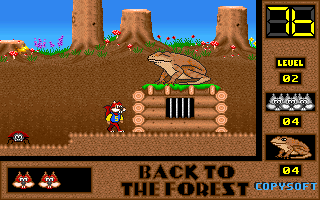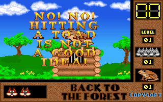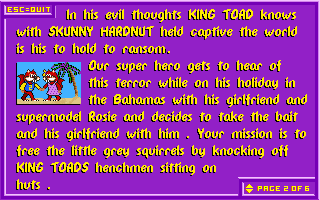 Votre mission est de libérer les petits écureuils gris en faisant tomber les crapauds assis sur les huttes-prisons. Cette tâche ne peut être accomplie que lorsque vous aurez mangé une super-noisette. Voyagez à travers le royaume de la forêt et vous ferez la rencontre d'insectes fous qui ne vous laisseront pas faire. Certains des petits écureuils gris qui ont échappés au Roi Crapaud ont préparé des "rafraîchissements" pour votre périlleux voyage. N'oubliez pas que vous ne pourrez pas renverser les sbires du Roi Crapaud sans super-noisette.