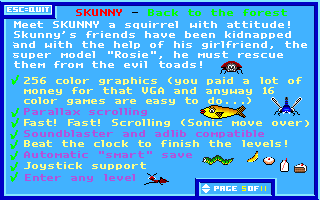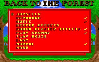 GameplayLa version shareware est composée de 2 niveaux tandis que la version complète en contient 10. Vous pouvez jouer avec Skunny ou Rosie. Il vous faudra aller dans les options du jeu pour changer de personnage.