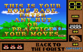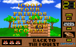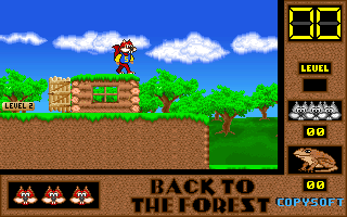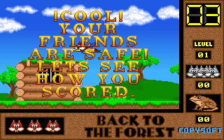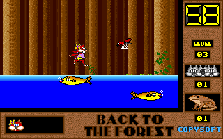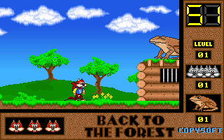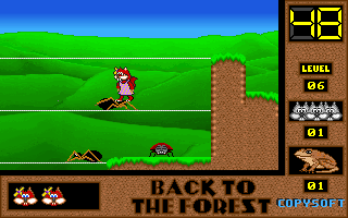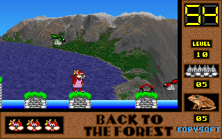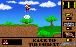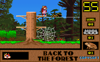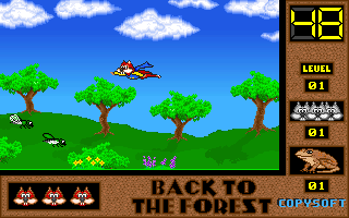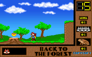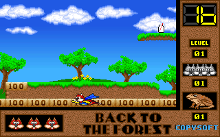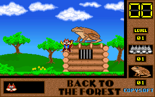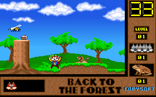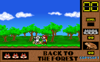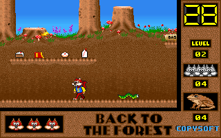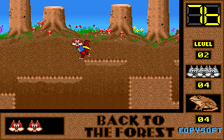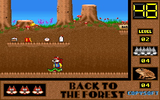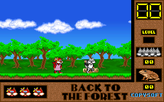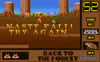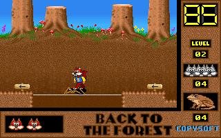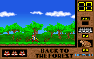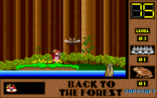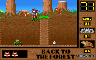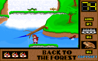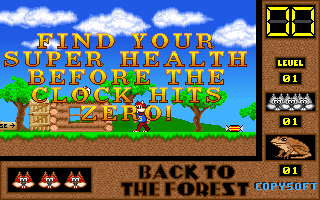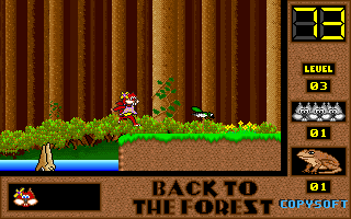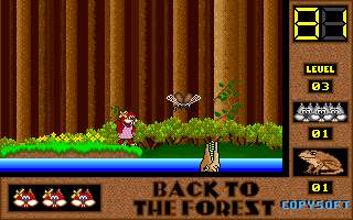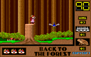 On commence la partie avec 3 vies mais on peut les récupérer à tout moment en faisant un aller retour entre un niveau et la carte du monde. Il est également possible de reprendre le jeu où on en était après un Game Over. Pas de barre de vie dans ce jeu mais un chrono qui débute à 60 secondes et qui diminue en fonction du temps et des collisions avec les insectes. Vous pouvez recharger le chrono avec la nourriture qui a été éparpillée dans la forêt. Attention ! La moindre collision avec un crapaud sans avoir mangé de super-noisette et c'est la mort. Une fois la super-noisette avalée, vous deviendrez invulnérable et vous pourrez voler.