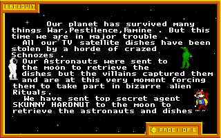 ScénarioNotre planète a survécu à de nombreuses choses : Guerre, Peste, Famine. Mais cette fois nous sommes en grande difficulté. Toutes nos antennes paraboliques ont été volées par une horde de Schnozes fous. Nos astronautes ont été envoyés sur la lune pour récupérer les paraboles mais les méchants les ont capturés et les forcent à prendre part à d'étranges rituels extraterrestres. Nous avons envoyés l'agent secret SKUNNY HARDNUT sur la lune pour sauver les astronautes et récupérer les paraboles.