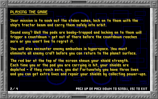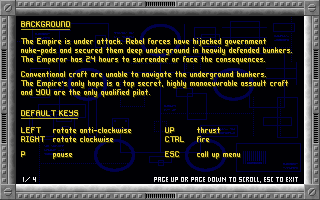 Scénario et gameplayL'Empire est attaqué. Les forces rebelles ont détourné des armes nucléaires du gouvernement et les ont sécurisées sous terre dans des bunkers fortement défendus. L'Empereur a 24 heures pour se rendre ou faire face aux conséquences. Les engins conventionnels sont incapables de naviguer dans les bunkers souterrains. L'Empire a encore un espoir top secret, un engin d'assaut avec une grande maniabilité, nom de code TerraFire et VOUS êtes le seul pilote qualifié. Votre mission est de rechercher les armes nucléaires volées, puis de les verrouiller, de les transporter grâce à votre rayon tracteur du vaisseau. Et de les placer en orbite, en toute sécurité. Ça semble facile ? Bien, les armes nucléaires sont piégées et le verrouillage dessus déclenche un compte à rebours - sortez les de là avant que le compte à rebours n'atteigne zéro ou vous ne serez plus en vie pour le regretter.