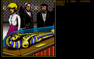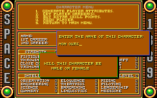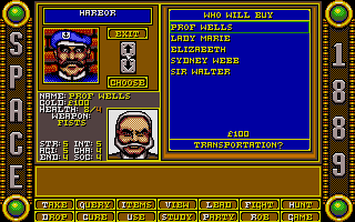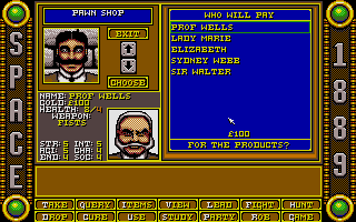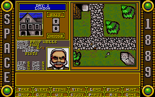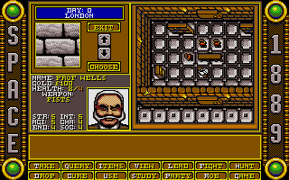 Le jeuLa dure réalité de la vie se rappellera bientôt à vous. Vous possédez des talents limités. A vous de bien répartir les points de compétences. Le système de répartition des points est particulièrement connu à la fin des années 1980 suivant en cela Ultima et autres productions liées à Donjon et Dragons. On lorgne ici toutefois plus vers l'Appel de Chtulhu pour la création des personnages. Outre les compétences basiques vues dans pratiquement tous les jeux de rôle, vous choisirez une profession et des points de compétences secondaires en fonction de votre rang social. Car n'oublions pas que si les créateurs ont imaginé un arrière-plan technologique assez fou, la pesanteur de la société victorienne est la même. N'espérez pas commencer en bas de l'échelle sociale pour finir au sommet ! A chacun sa place dans cette Angleterre qui s'apprête à fêter le jubilé de la reine Victoria. Space 1889 est un jeu d'action/jeu de rôle avec une vue de dessus. Le système de jeu avait été popularisé avec Zelda. L'écran où le personnage est affiché ne représente qu'une fraction de l'écran total. Ceci est typique de la fin des années 80 où les développeurs faisaient face à de nombreuses contraintes techniques. Du côté du gameplay, la prise en main est rapide. On notera un accès aux principales actions via une interface disponible en bas de l'écran. Voilà pour l'emprunt aux points & clicks de l'époque. Les combats sont à éviter et la gestion de la faim et de la fatigue apparaissent anecdotiques. La possibilité d'exploration faute d'un chemin balisé rebutera plus d'un joueur et peu arriveront sur Mars ou Mercure. Un chemin plus balisé aurait sans doute rendu le jeu plus immersif.