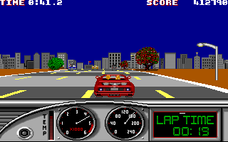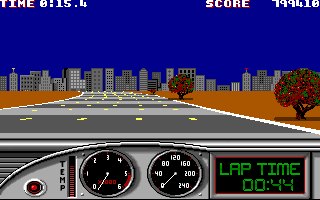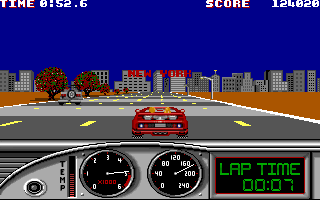 Description du jeu et avisVroum Vroum ! Faîtes vrombir les moteurs et lancez-vous ! Le titre du jeu ne fait pas mystère de l'intrigue. A bord d'un bolide, le pilote et sa passagère se lancent dans une course effrénée pour le titre. L'objectif est bien évidemment d'être le plus rapide. Si les couleurs colorées et le bolide rouge ou encore le titre du soft vous font penser à Out Run, c'est normal ! Turbo Out Run est la suite du légendaire jeu de course. Le jeu avait profondément marqué une génération de joueurs de bornes d'arcade avec ses commandes novatrices et son simili cockpit. L'adaptation sur différents ordinateurs avait fait mouche. La suite était donc fortement attendue !